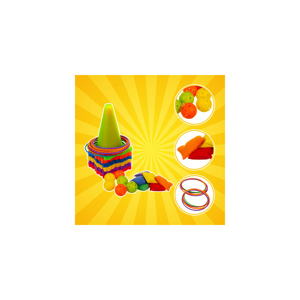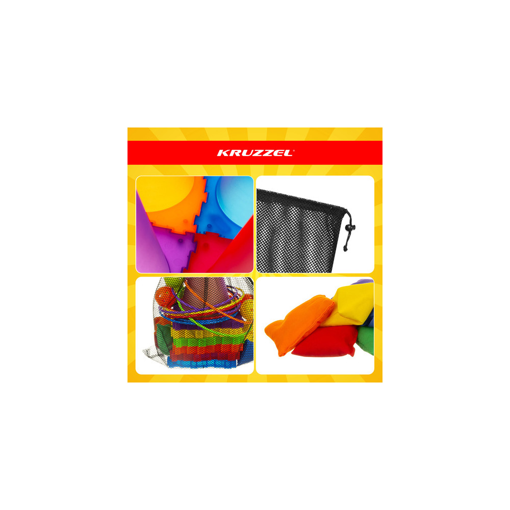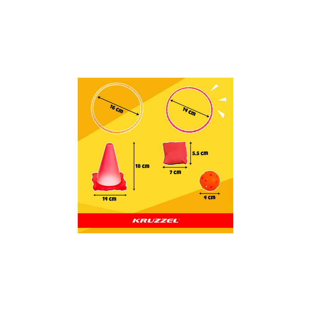Rozměr: pytlík 7 x 5,5 cm, malá obruč 14 cm, velká obruč 16 cm, míček 4 cm, kužel 18 x 14 cm