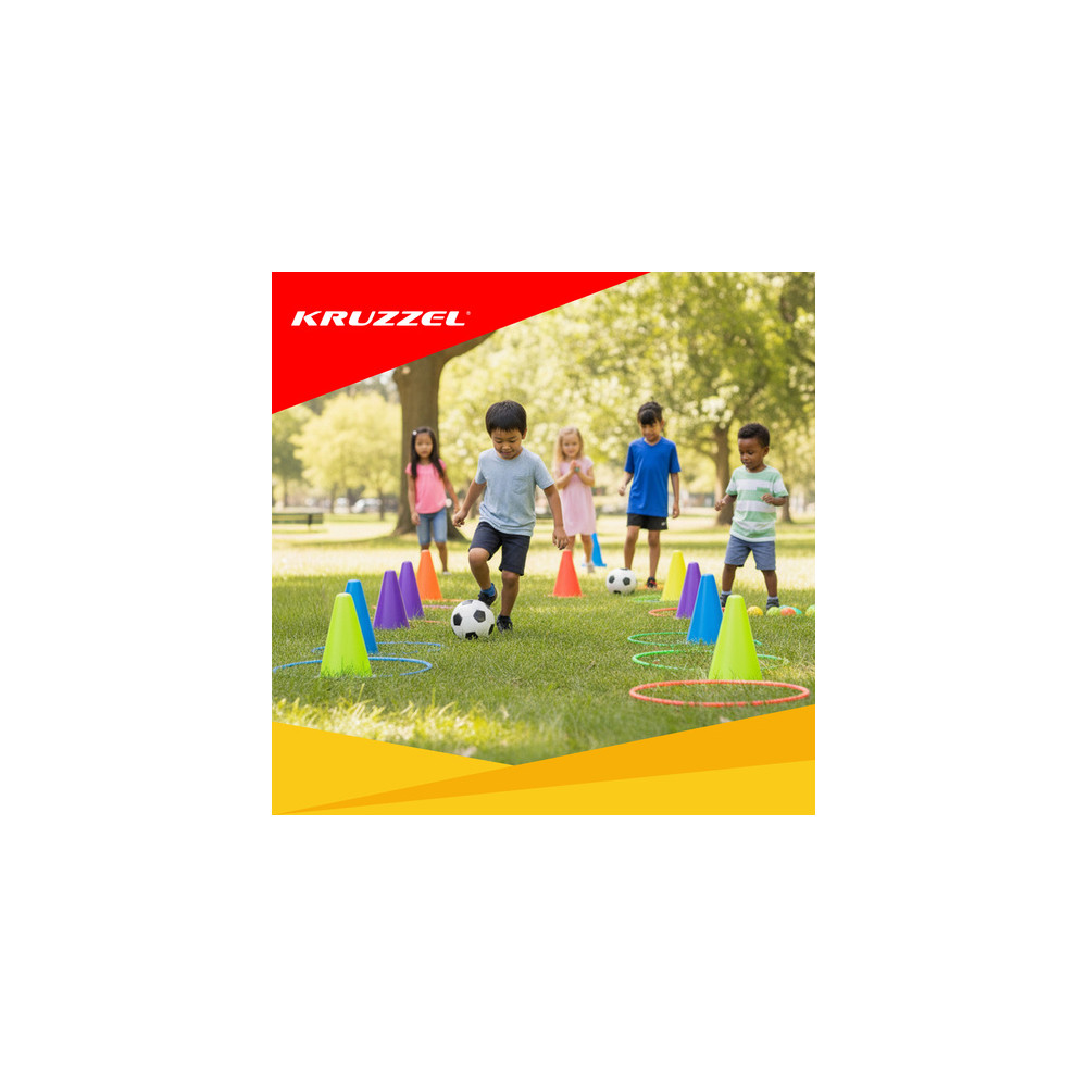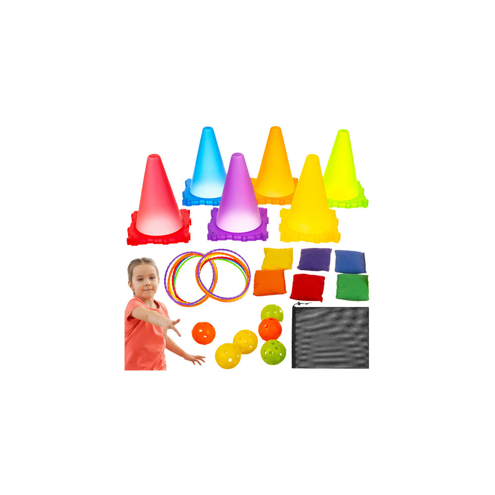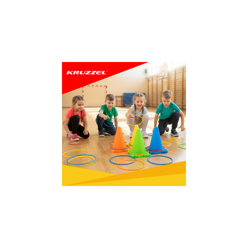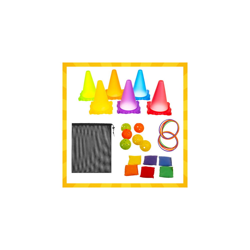 Rozměr: pytlík 7 x 5,5 cm, malá obruč 14 cm, velká obruč 16 cm, míček 4 cm, kužel 18 x 14 cm
