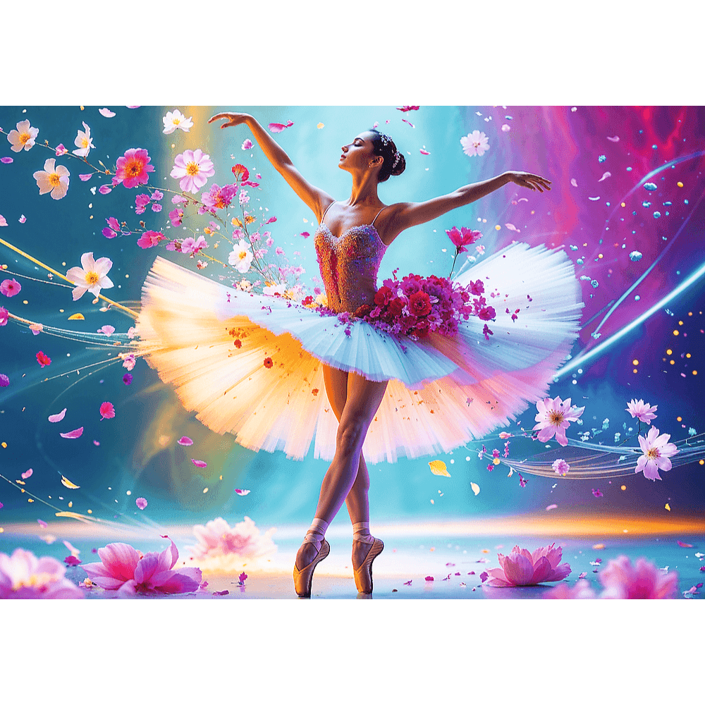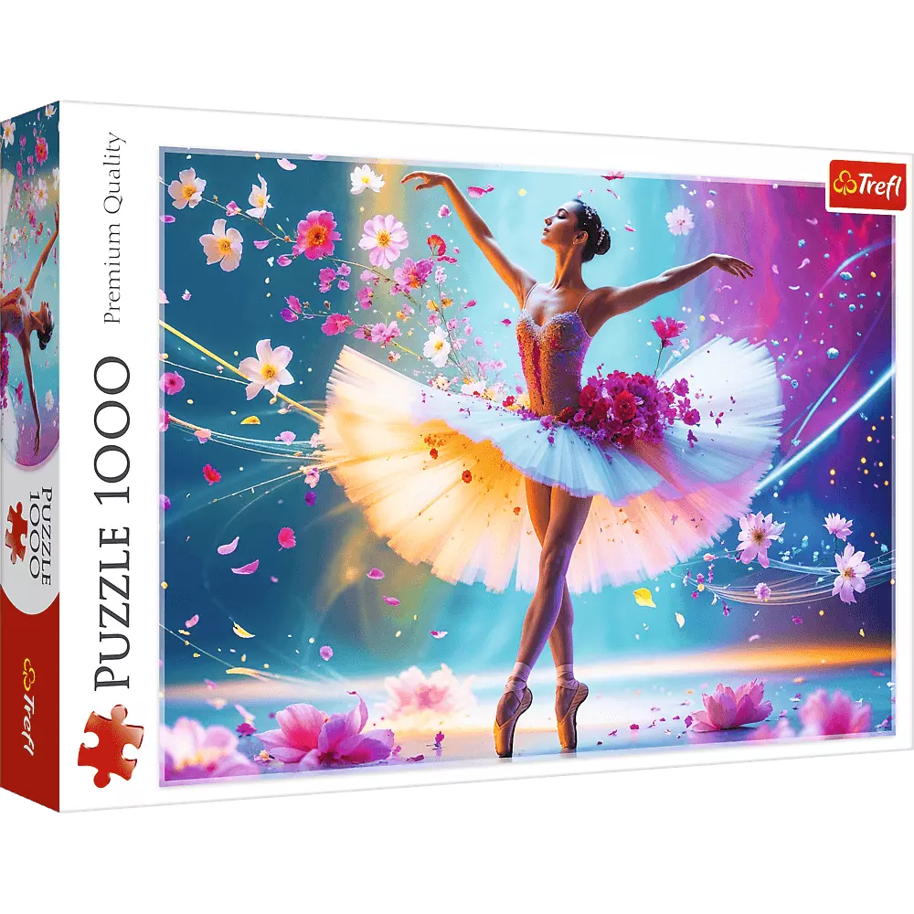 Puzzle od značky Trefl s barevným motivem tančící baletky s květinami.