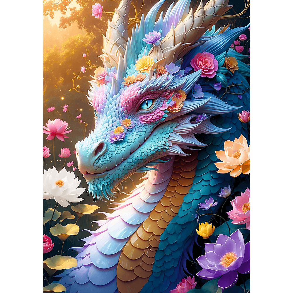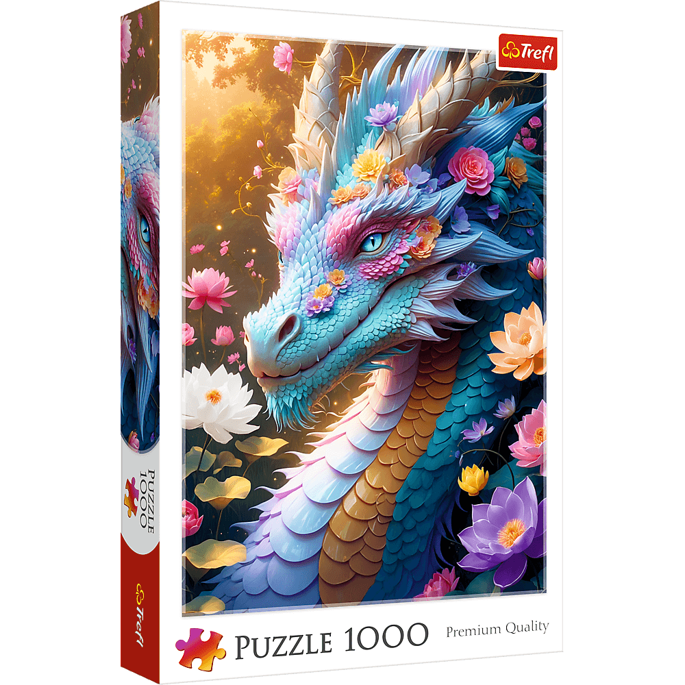 Puzzle od značky Trefl s barevným motivem draka v květinách.