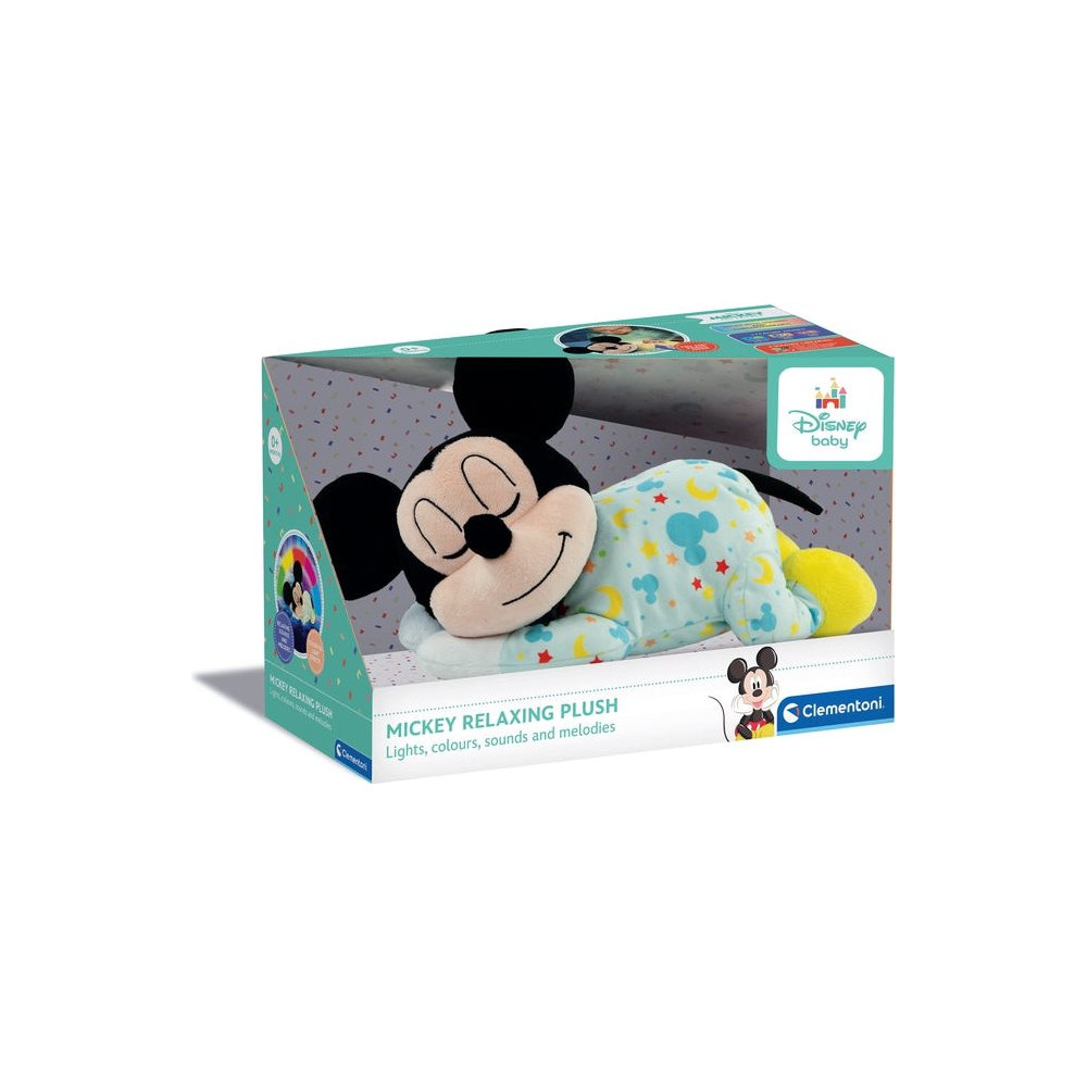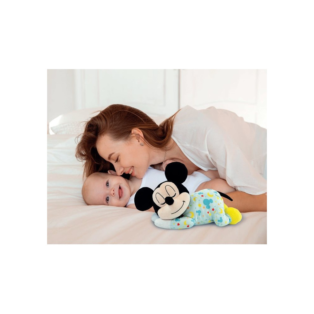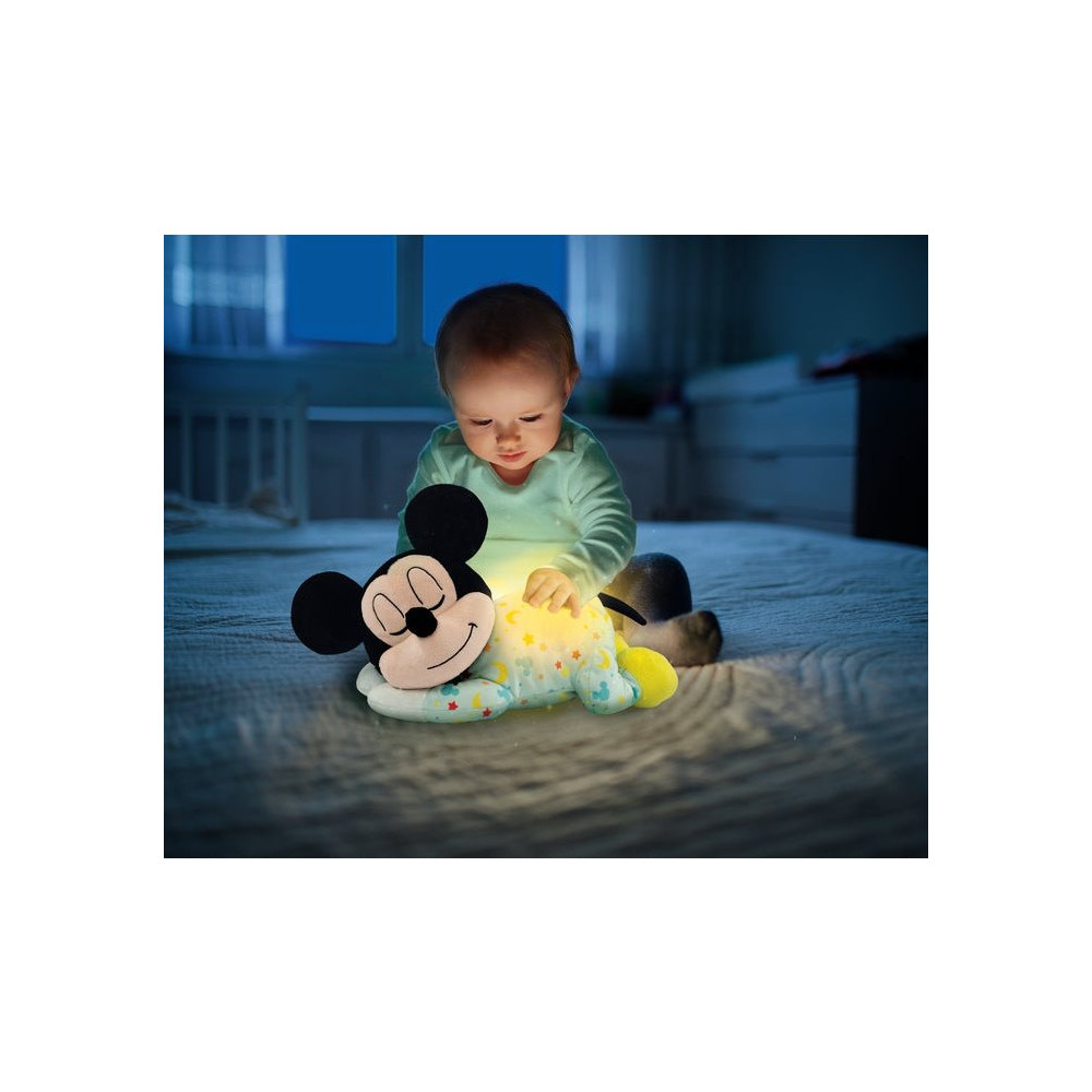 Měkoučký plyšový Mickey pomáhá uklidnit a uvolnit dítě díky chromoterapii a jemným melodiím. Přehrává bílé šumy, klasickou hudbu, melodie i tlukot srdce. Barevná světla s měnící se intenzitou mají uklidňující účinek. Je neodolatelný díky roztomilému designu a pyžámku s nočním motivem. Plyšová hračka vytvořená pro pohodu a klid dítěte.
