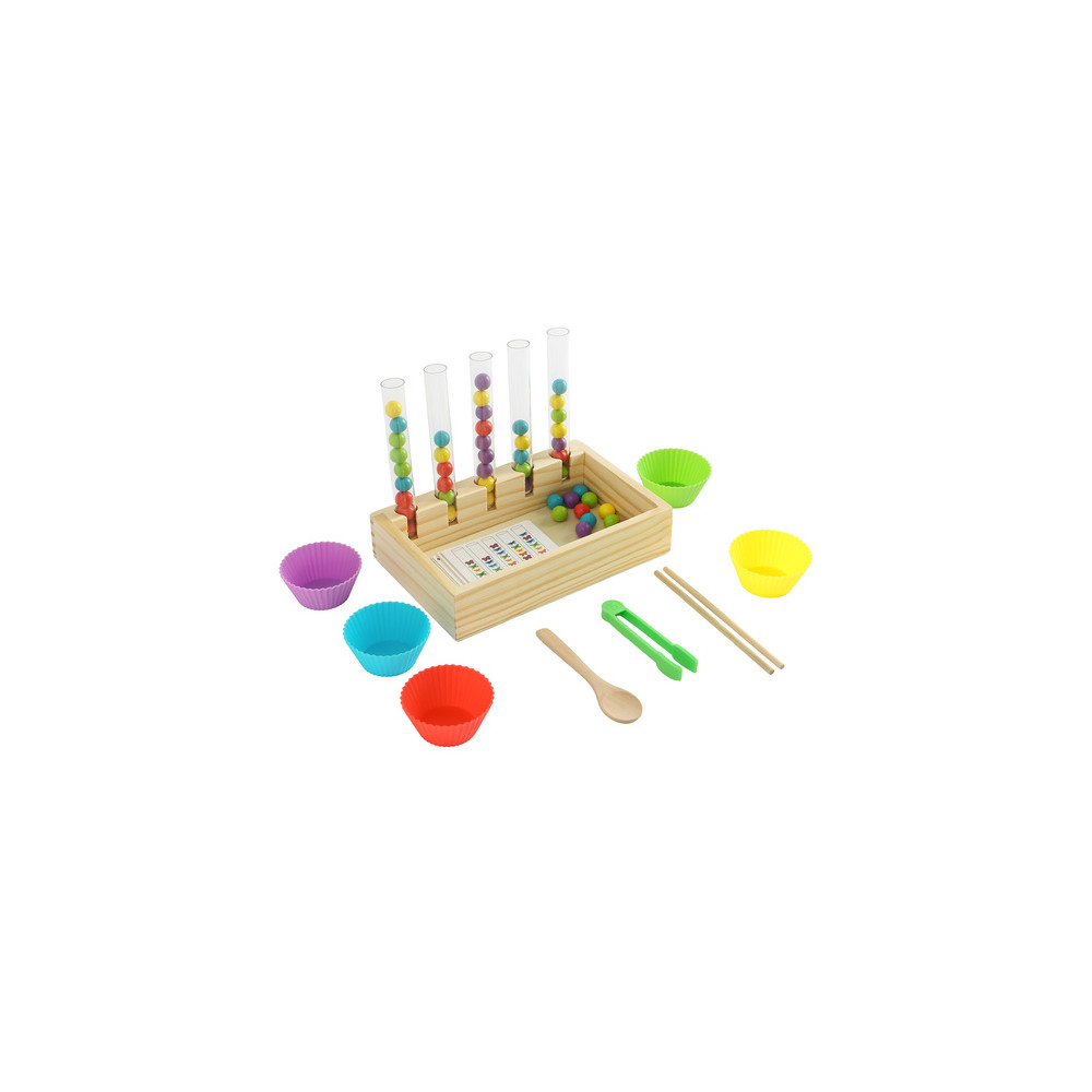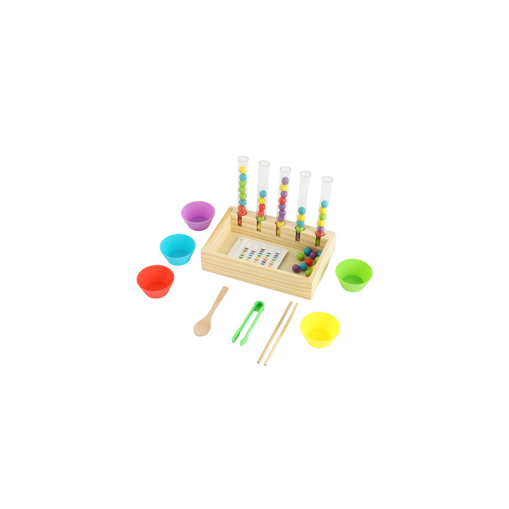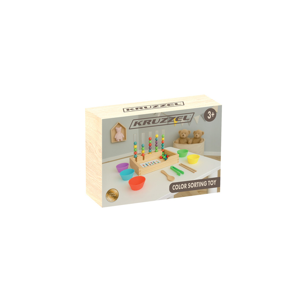 Dřevěná vzdělávací hračka při které se děti učí třídit a rozpoznávat barvy. Vhodné pro rozvoj jemné motoriky a koordinaci ruka-oko. Karty se vzory jsou součástí balení.
