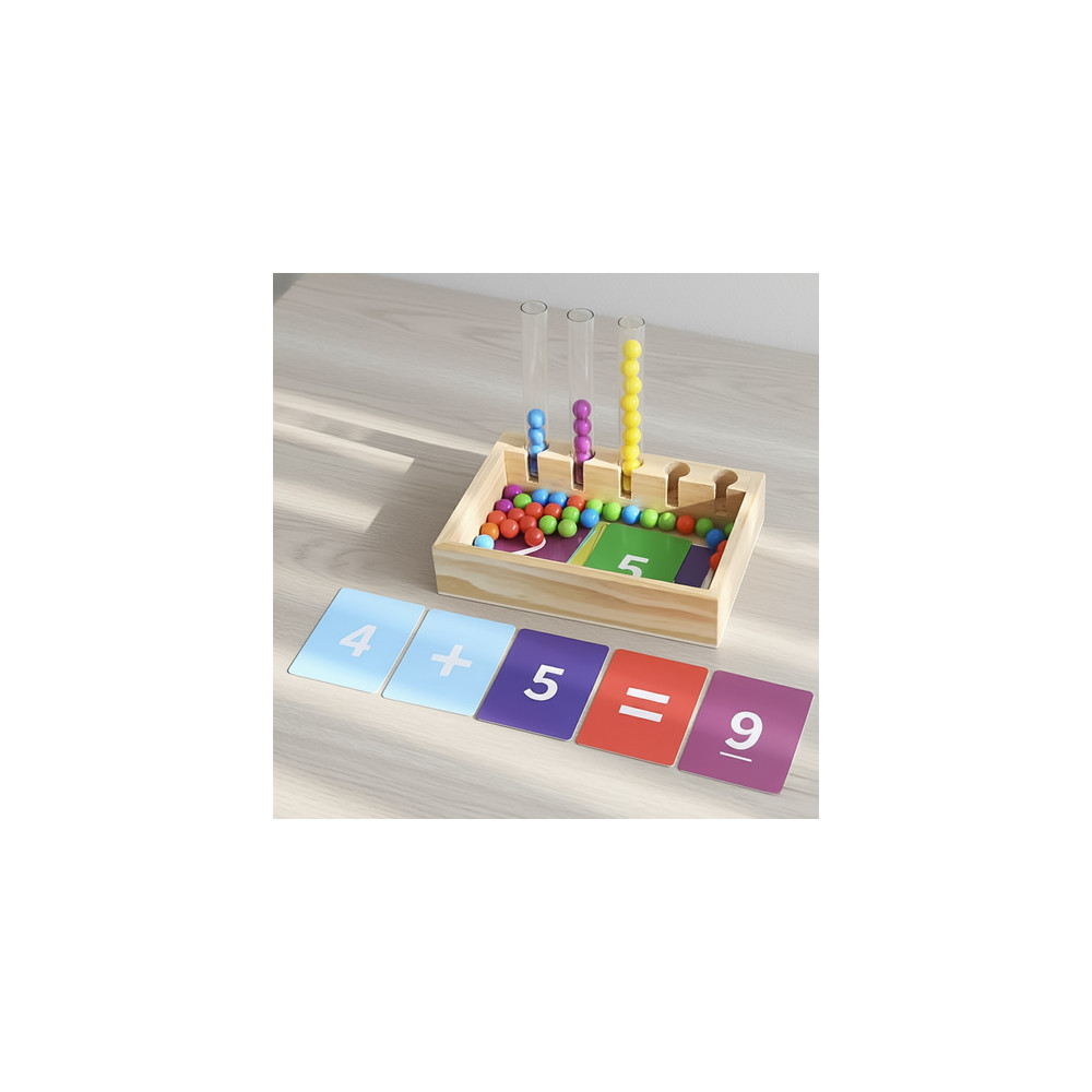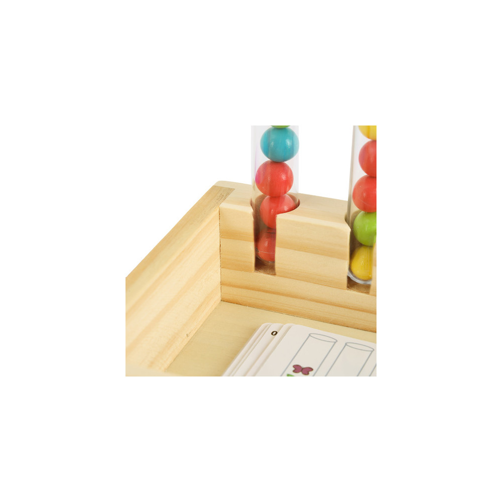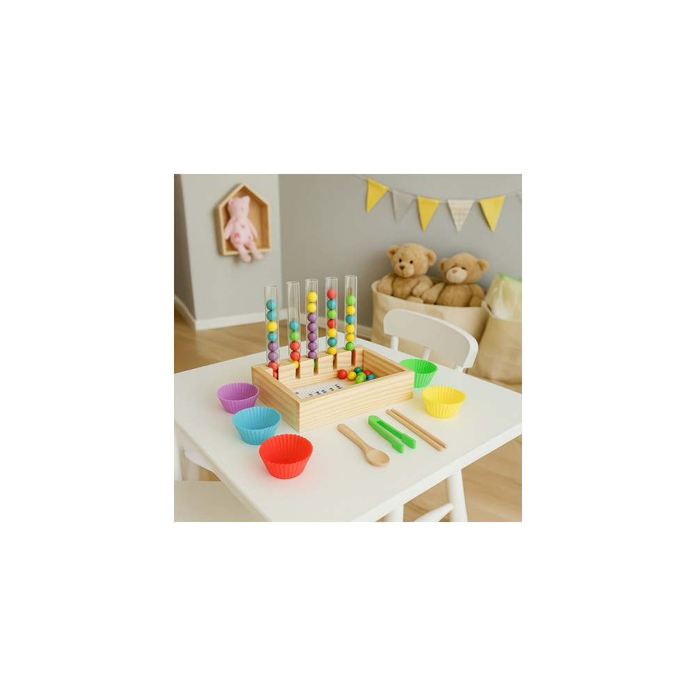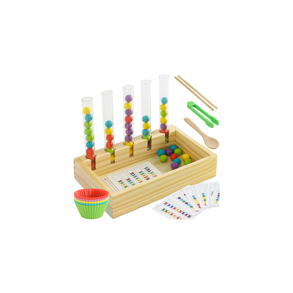 Dřevěná vzdělávací hračka při které se děti učí třídit a rozpoznávat barvy. Vhodné pro rozvoj jemné motoriky a koordinaci ruka-oko. Karty se vzory jsou součástí balení.