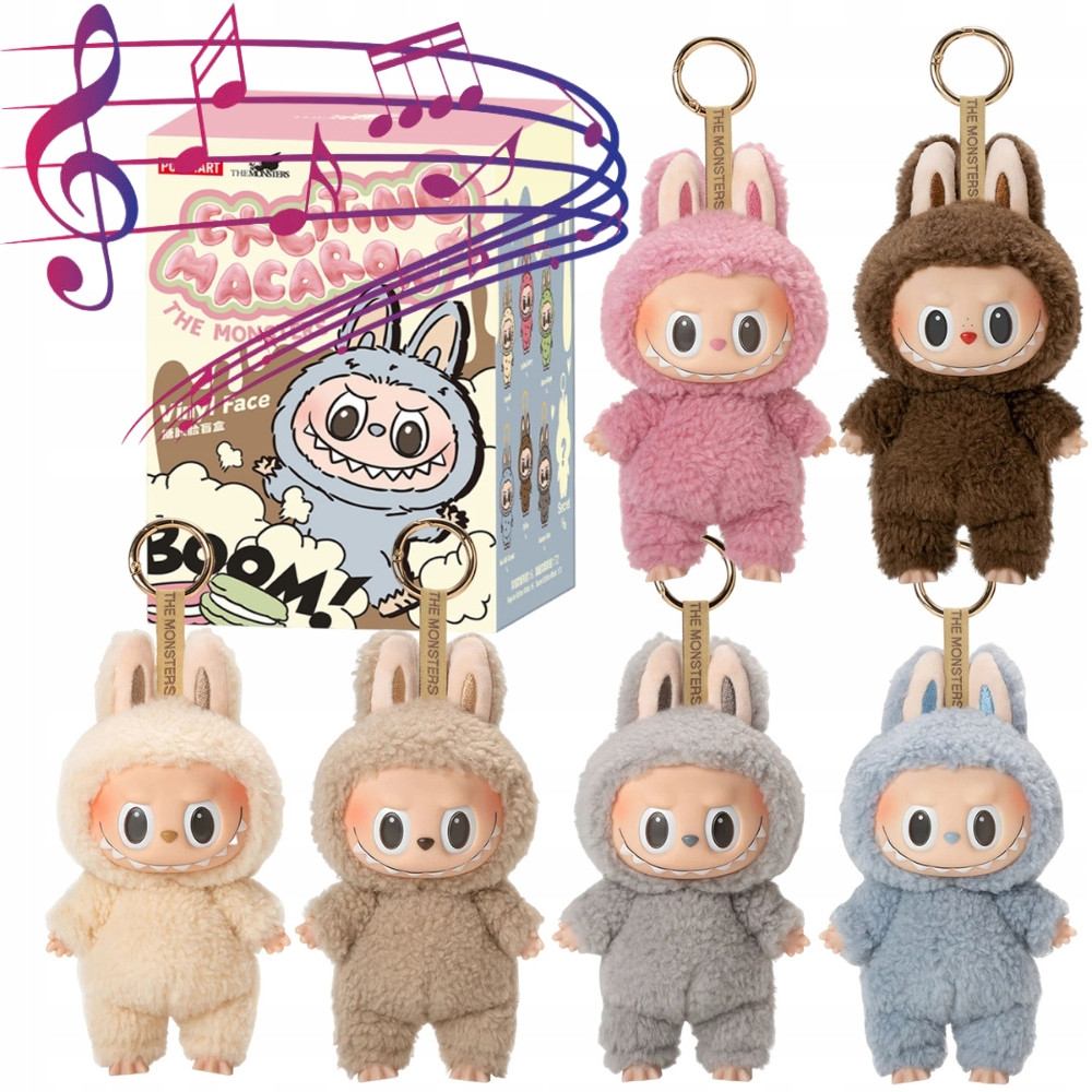 Labubu plyšová postavička, která hraje a svítí jí hlava. S poutkem na zavěšení. Balení obsahuje jednu ze 6 variant nebo 1 tajnou variantu.