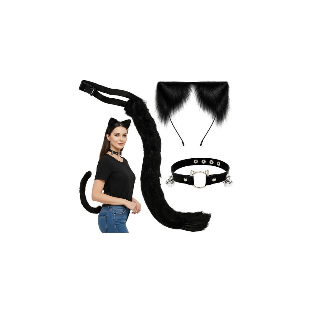 Originální doplněk ke kostýmu jako kočka z umělé kožešiny. Součástí balení jsou chlupatá ouška na čelence, která má univerzální velikost. Dále pak obojek na krk s rolničkami a dlouhý chlupatý ocas, který si připevníte kolem pasu. Uvnitř ocasu je zabudovaný drát, můžete si jej tedy dle libosti nastavit do různých pozic.