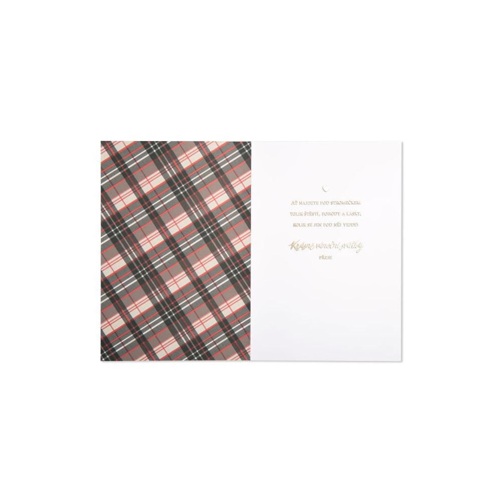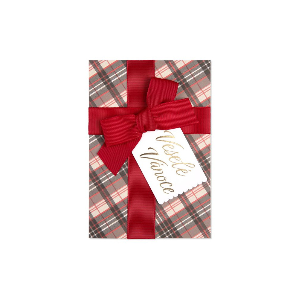 Luxusní vánoční přání s velkou červenou mašlí připomíná vánoční dárek zabalený do károvaného papíru. Kromě 3D mašle zdobí přední stranu také dárková jmenovka se zlatým nápisem Veselé Vánoce. Uvnitř pak najdete milé věnování napsané zlatým písmem a spoustou místa pro dopsání vlastního textu.