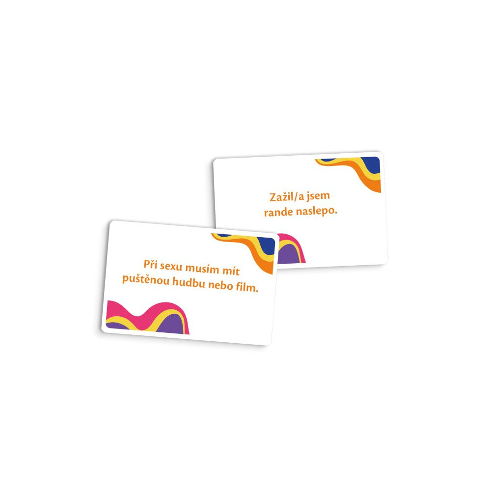 Hra Přiznej barvu - Kamarádi 18+ obsahuje: 89 karet s výroky, 10 kartiček ANO, 10 kartiček NE a pravidla hry.