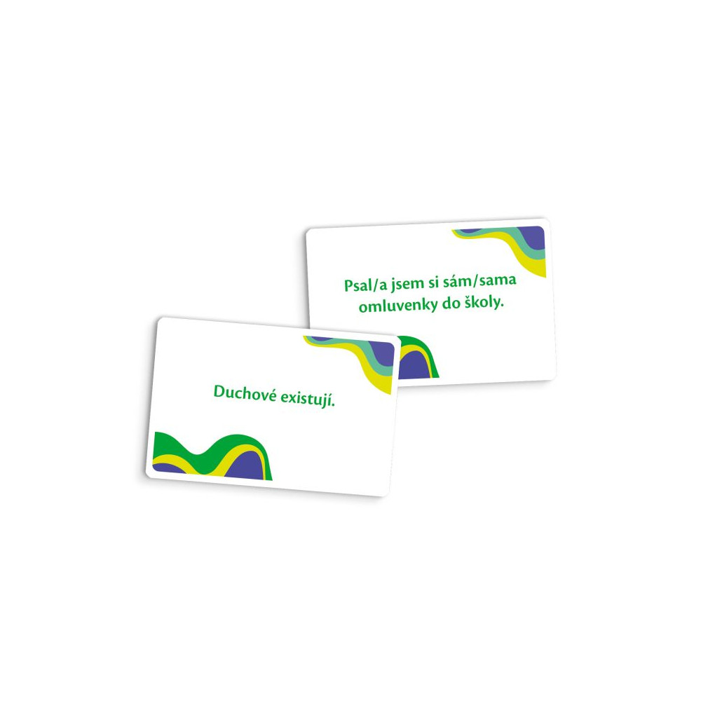 Hra Přiznej barvu - Kamarádi obsahuje: 89 karet s výroky, 10 kartiček ANO, 10 kartiček NE a pravidla hry.