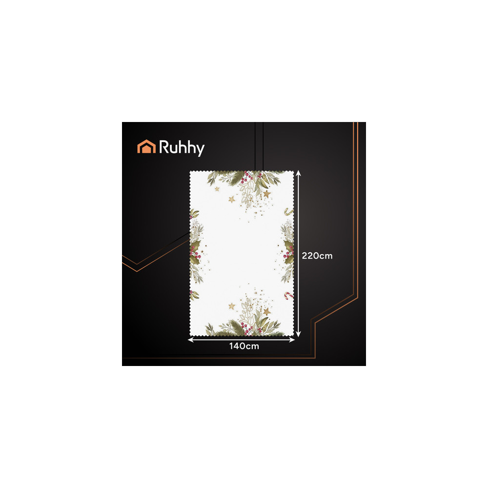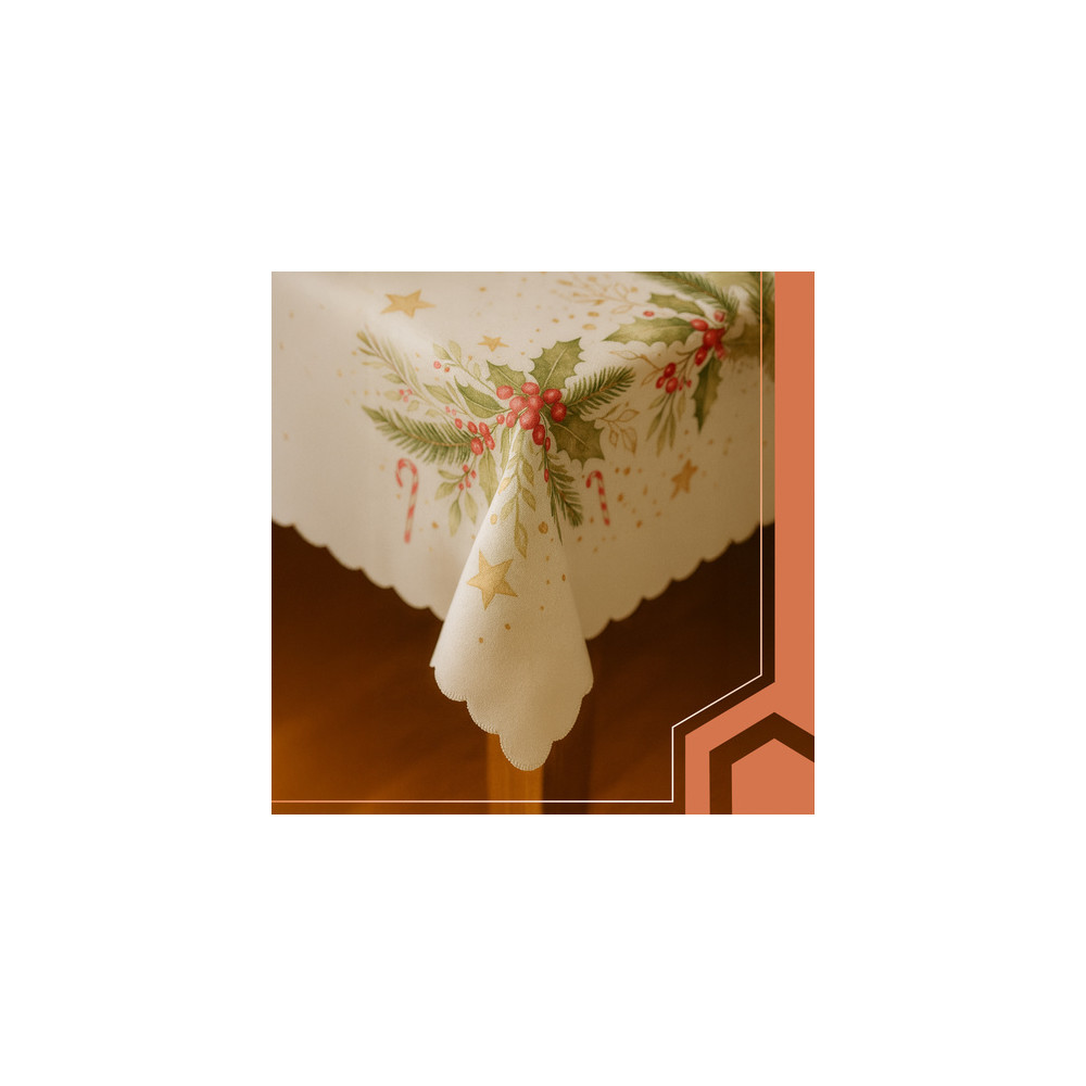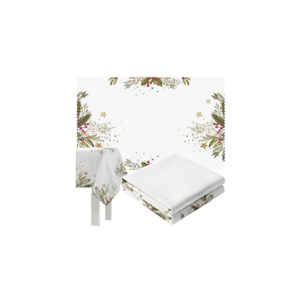 Krásný vánoční ubrus v bílé barvě se zelenkavými detailem. Ubrus je vyrobený ze tkaného polyesteru.