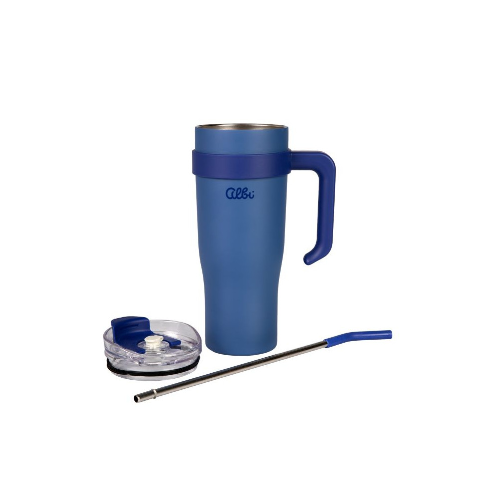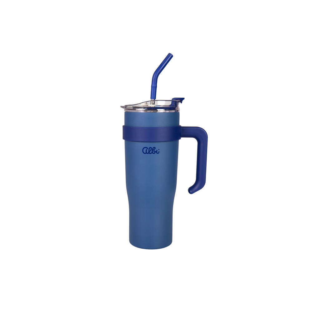 Tumbler s protiskluzovým povrchem má praktickou rukojeť pro snadné přenášení a speciální víčko, které umožňuje pití jak přes brčko, tak i přímo.