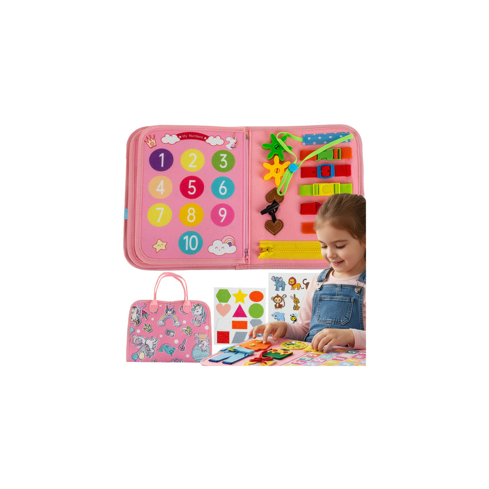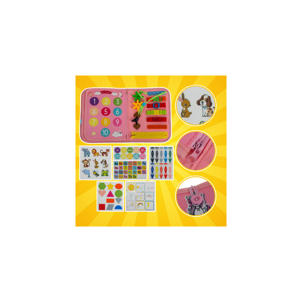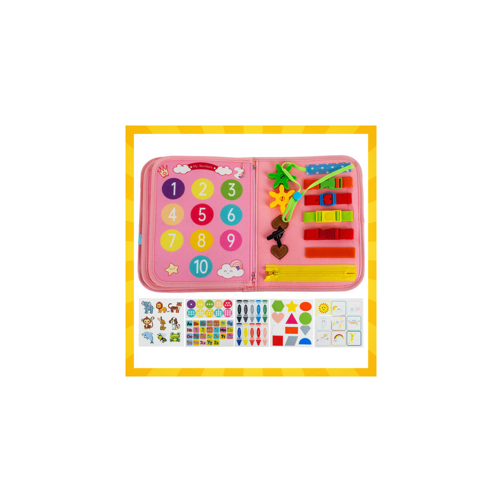 Senzorická vzdělávací knížka pro děti plný různých manipulačních aktivit. Tato interaktivní hračka stimuluje manuální rozvoj, soustředění a kreativitu a zapojuje všechny smysly dítěte.