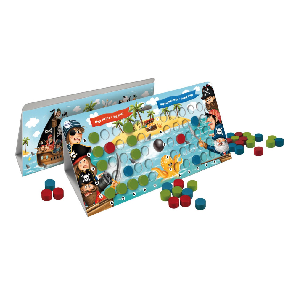 Námořní bitva je tradiční bojovou hrou pro děti i dospělé, obsahuje 2 kartonové, ilustrované stojany na dřevěné kameny (střely) a 144 ks kamenů.