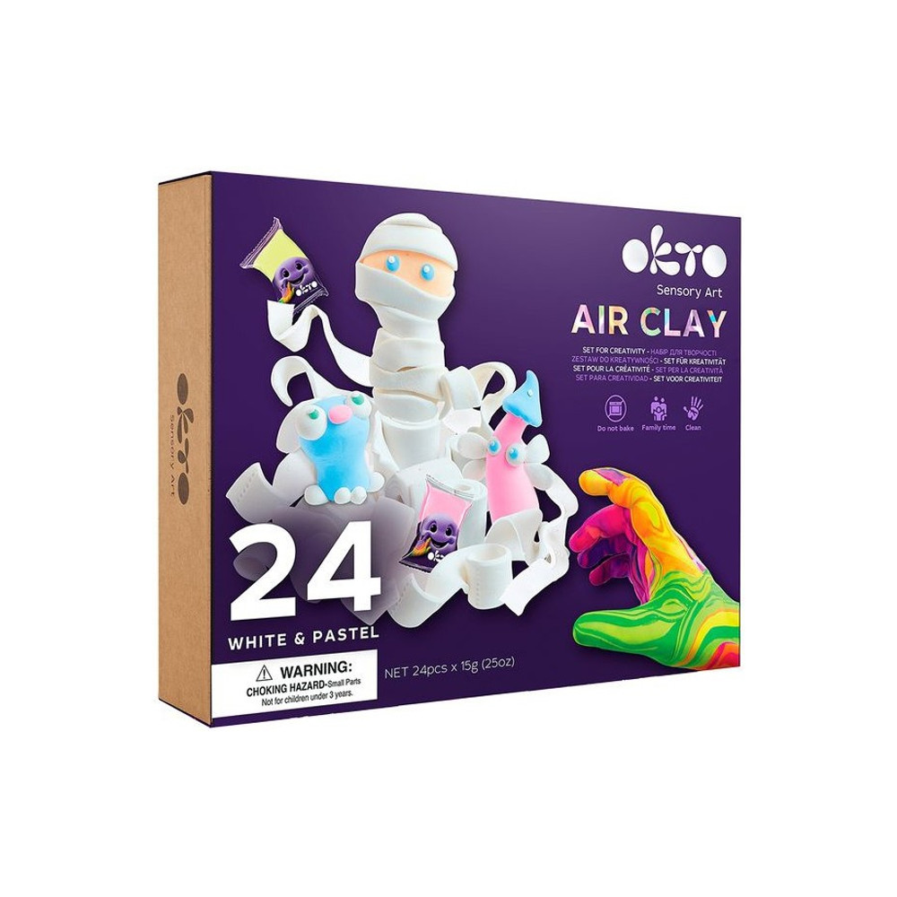 Kreativní sada značky OKTO, která obsahuje samoschnoucí modelovací hmota v setu 24 barev převážně v bílé a pastelových odstínech.