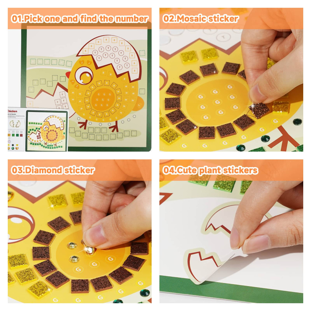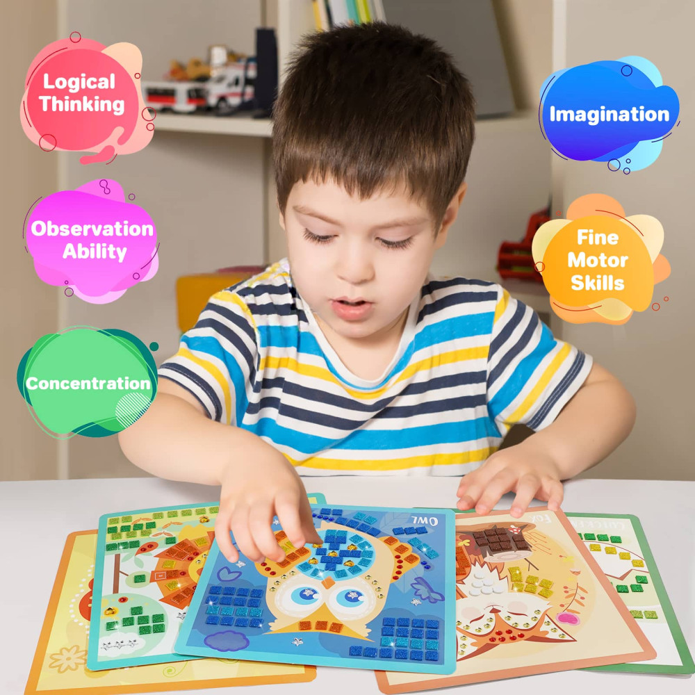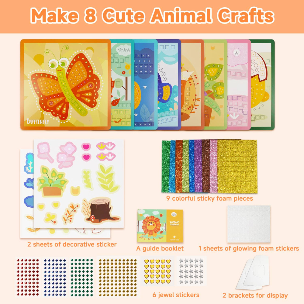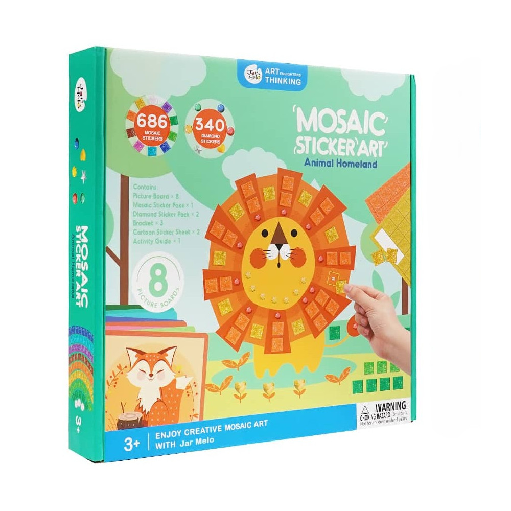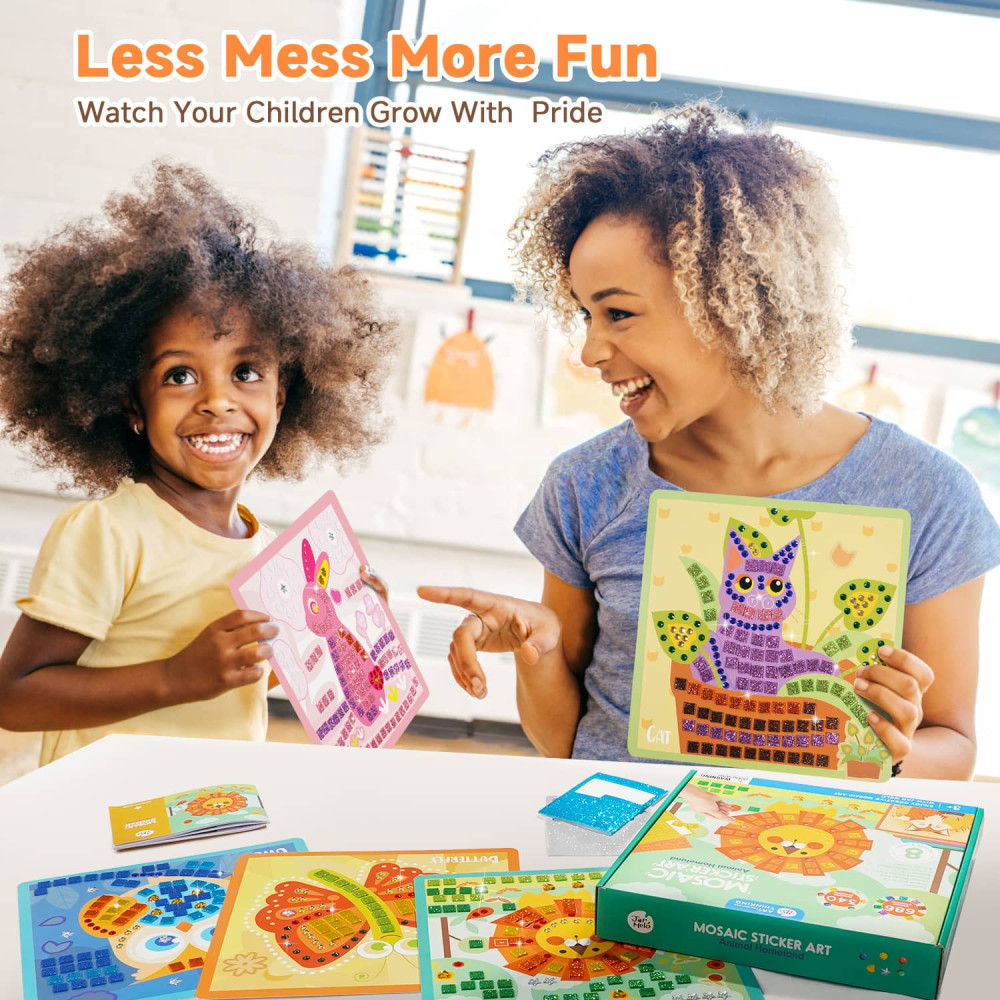 Vytvořte si vlastního zvířecího hrdinu. Tato variabilní mozaiková sada od Jarmelo umožňuje dětem rozvíjet jemnou motoriku a kreativní myšlení bez nepořádku. Děti nalepí barevné pěnové čtverečky a třpytivé kamínky na předtištěné zvířecí ilustrace, čímž vytvoří vizuálně atraktivní a hmatové výtvory.