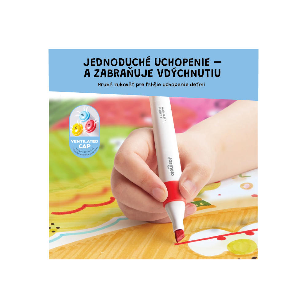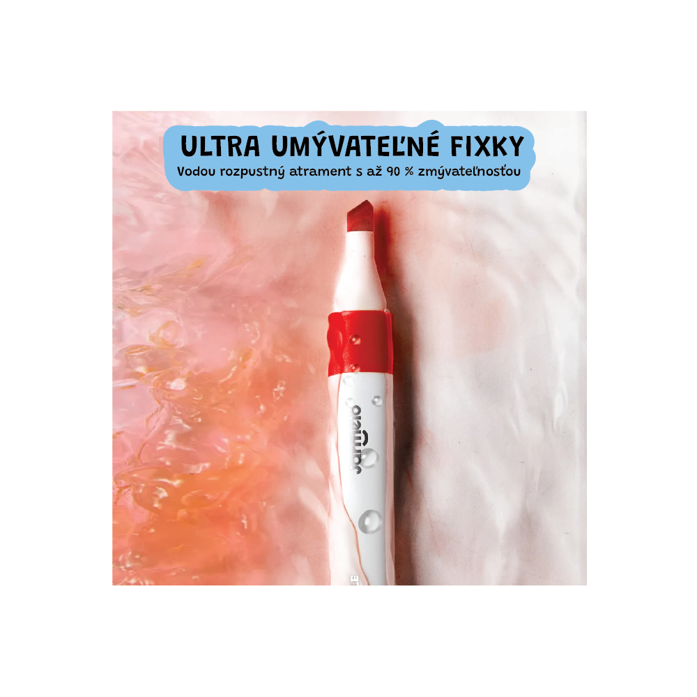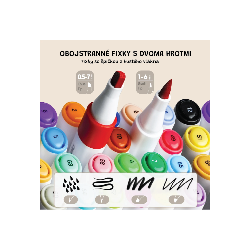 Jedna strana je ve tvaru jemného štětce a druhá je se šikmým hrotem. Fixy jsou umyvatelné, takže se snadno čistí z rukou, stolu či oblečení.