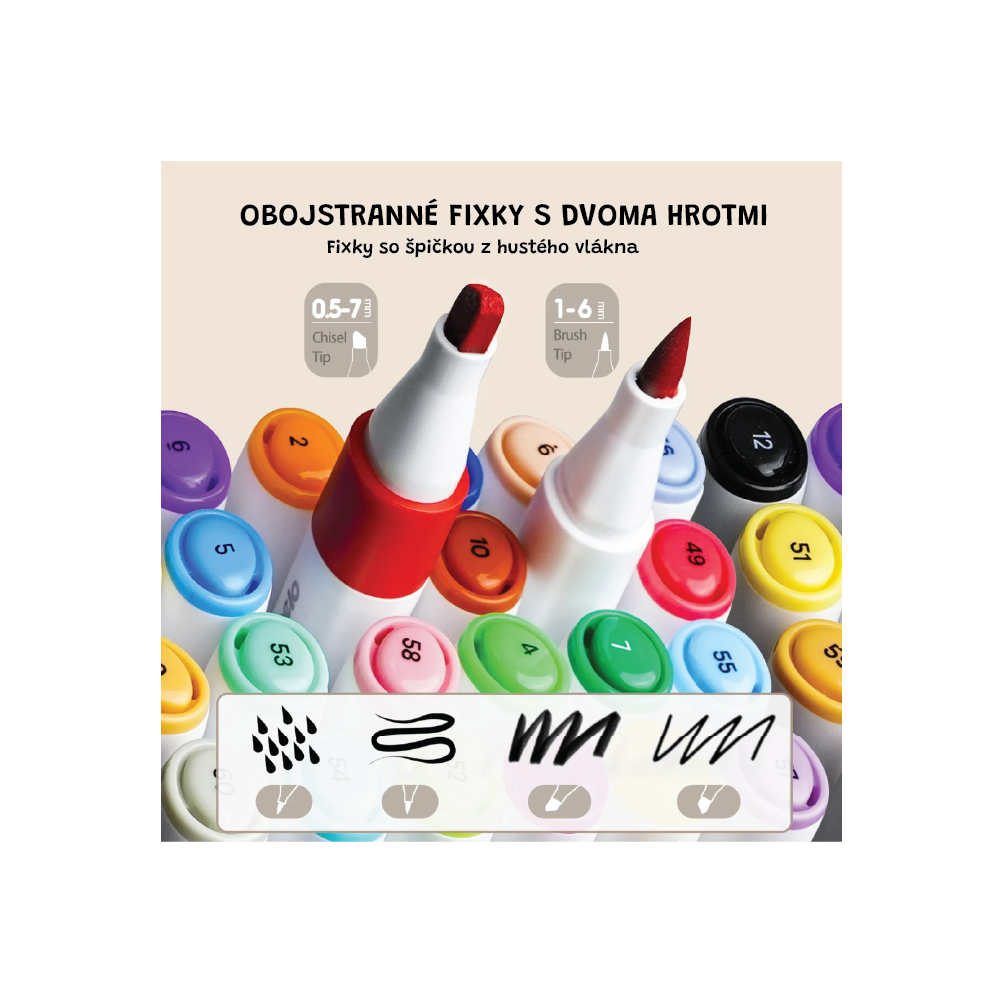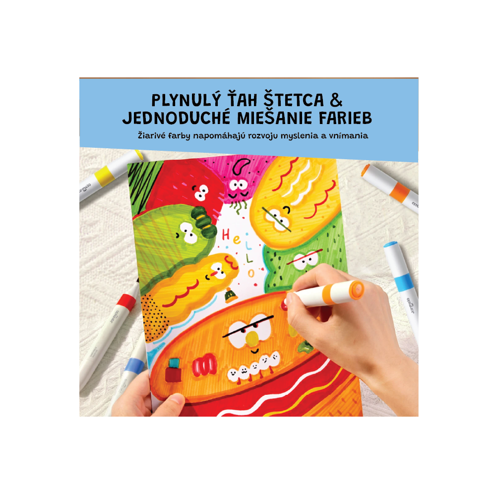 Dvojitá dávka barev pro malé i velké umělecké výtvory v chytrém balení. Oboustranné fixy přinášejí kombinaci jemného štětce a šikmého hrotu pro maximální kreativní možnosti. 48 zářivých odstínů umožní dětem i starším tvůrcům nakreslit ty nejkrásnější příběhy. Navíc si je mohou s sebou vzít kamkoli díky praktickému boxu. Jedna strana je ve tvaru jemného štětce a druhá je se šikmým hrotem. Fixy jsou umyvatelné, takže se snadno čistí z rukou, stolu či oblečení.