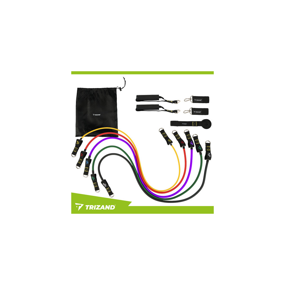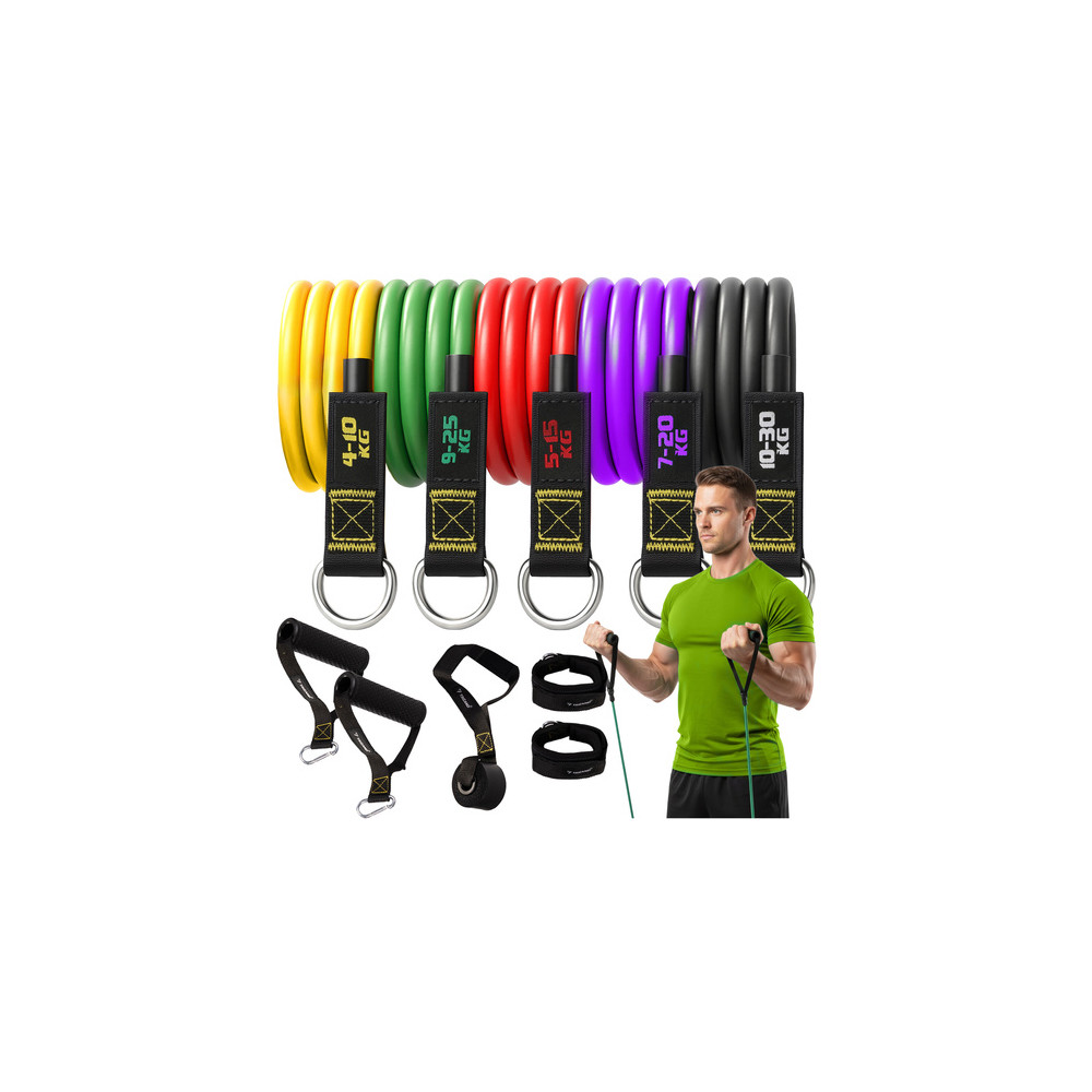 Sada posilovacích odporových gum pro efektivní trénink doma i v posilovně. Za pomoci těchto gum můžete trénovat třeba záda, paže i břicho. Součástí balení jsou gumy s 5 různými stupni odporu, úchytky a háček na dveře. Vše je uloženo v praktickém stahovacím sáčku.