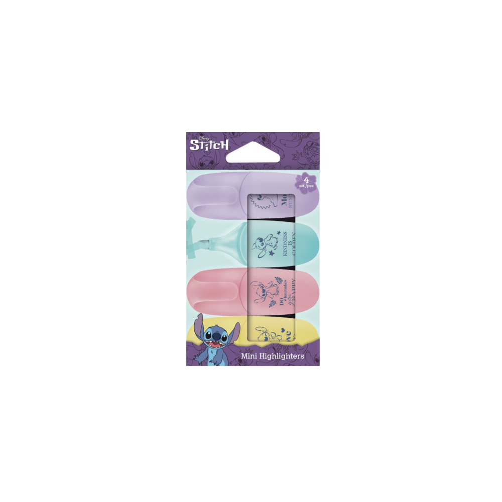 Malé, stylové a praktické. Představujeme vám zvýrazňovače, které vám udělají náladu - a nejen tu školní! Sada 4 MINI zvýrazňovačů Stitch v jemných pastelových barvách je ideální do penálu, na poznámky, diáře i kreativní projekty.