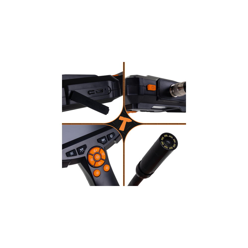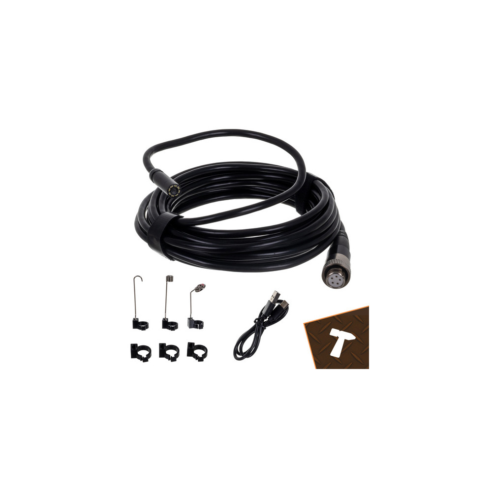 Pevný kabel, který je 5 metrů dlouhý zajišťuje stabilitu a přesné vedení kamery, takže ani v úzkých, hlubokých nebo zakřivených prostorech se neohýbá ani nepadá, což usnadňuje ovládání a přesnost práce. 8 LED diod s nastavitelným jasem zaručuje vynikající viditelnost v tmavých a uzavřených prostorách. Díky nastavení jasu (0 %, 60 %, 80 %, 100 %) si můžete snadno přizpůsobit osvětlení podmínkám, ve kterých pracujete.