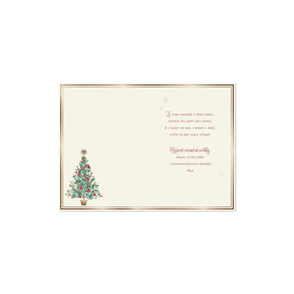 Text uvnitř přání: Za zvuku zvonečků a vůně cukroví, nastává čas, který všem napoví, že s klidem na duši, s radostí u srdce, vítáme po roce veselé Vánoce. Krásné vánoční svátky, spoustu milých dárků i nezapomenutelných okamžiků přeje...