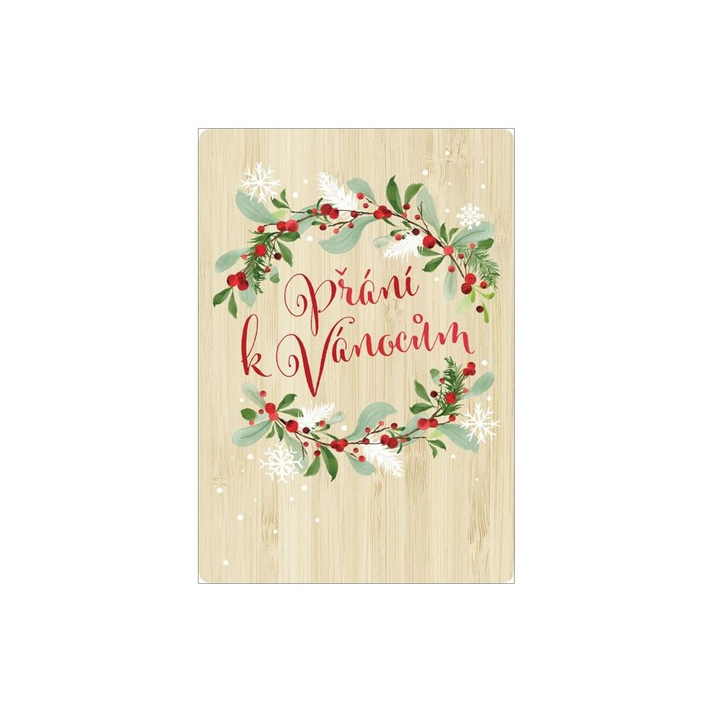 Vánoční přání s tvrdými bambusovými deskami. Klasický nápis Přání k Vánocům lemuje jemný vánoční věnec plný bobulí, peříček a sněhových vloček. Vnitřní strana přání ukrývá krátkou báseň v rámečku, která je umístěna na červeném károvaném podkladu. Pod básní je prostor pro vaše vlastní věnování či podpis.