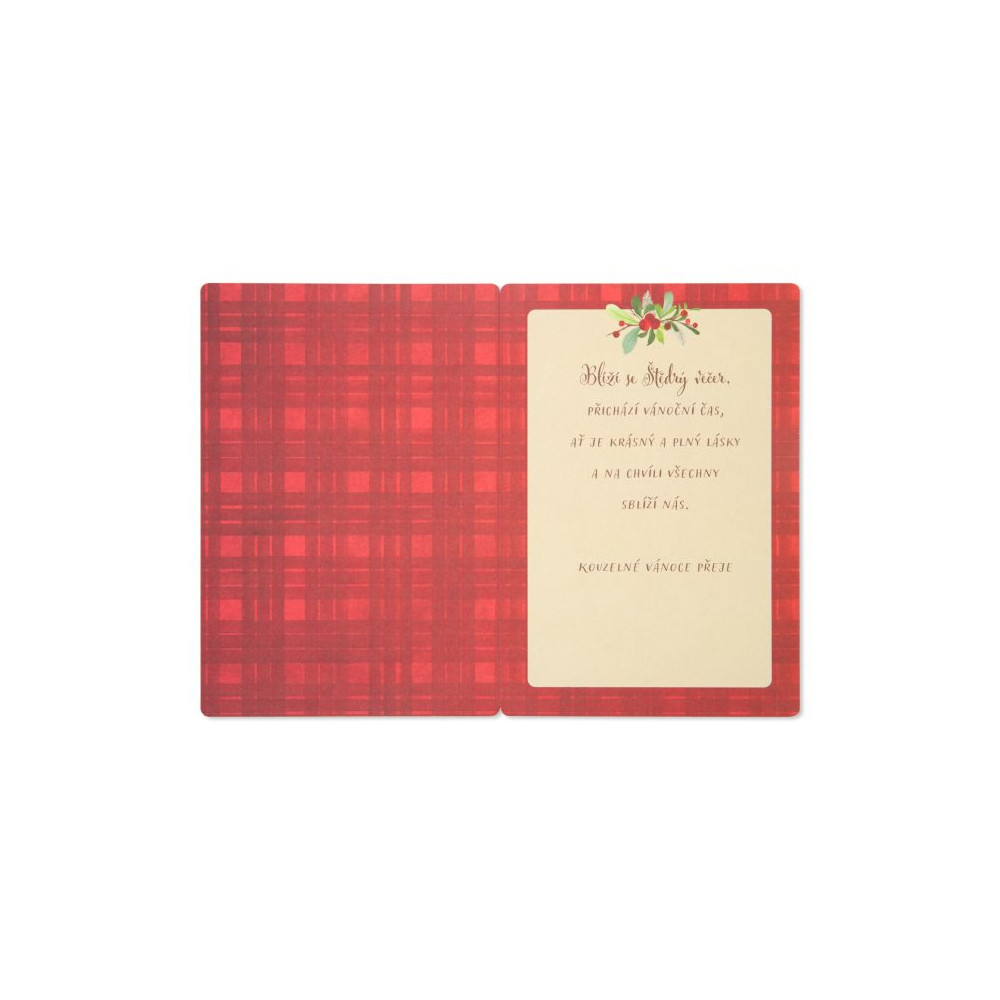 Text uvnitř přání: Blíží se Štědrý večer, přichází vánoční čas, ať je krásný a plný lásky a na chvíli všechny sblíží nás. Kouzelné Vánoce přeje...