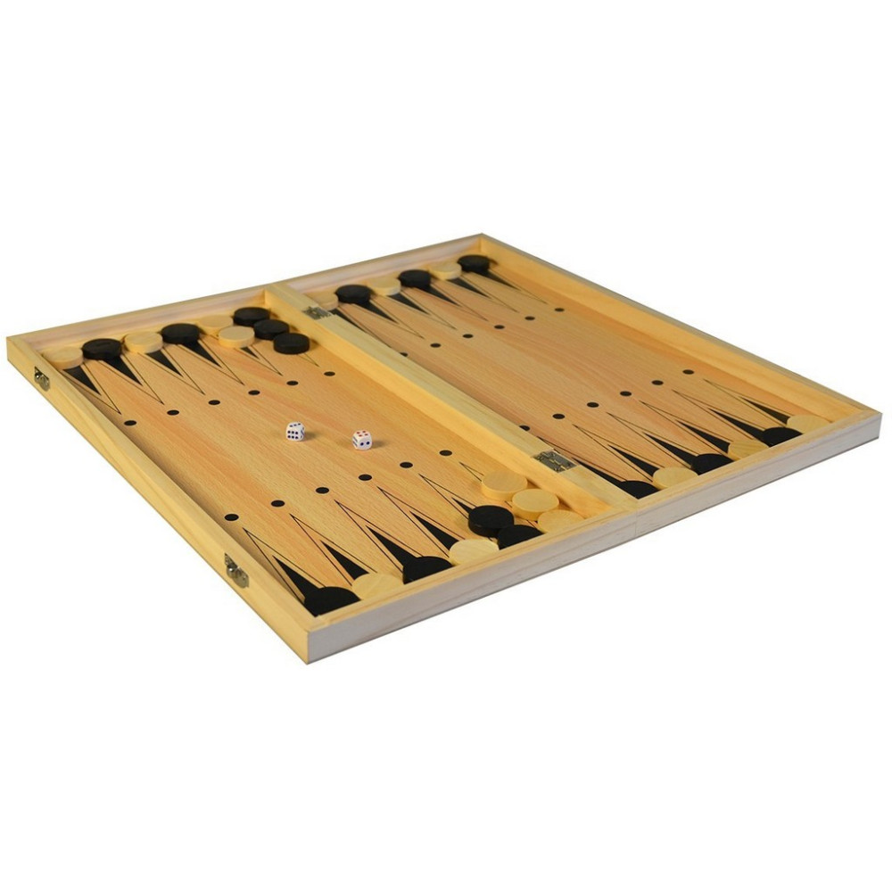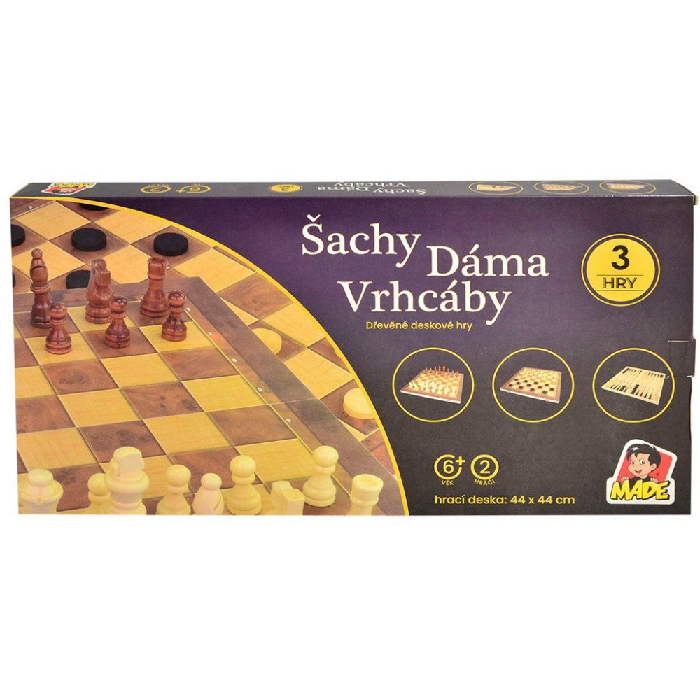Tato klasická společenská hra obsahuje šachy, dámu a backgamon. Figurky jsou vyrobené ze dřeva. Hrací deska slouží zároveň jako box pro úschovu figurek a hracích kostek.