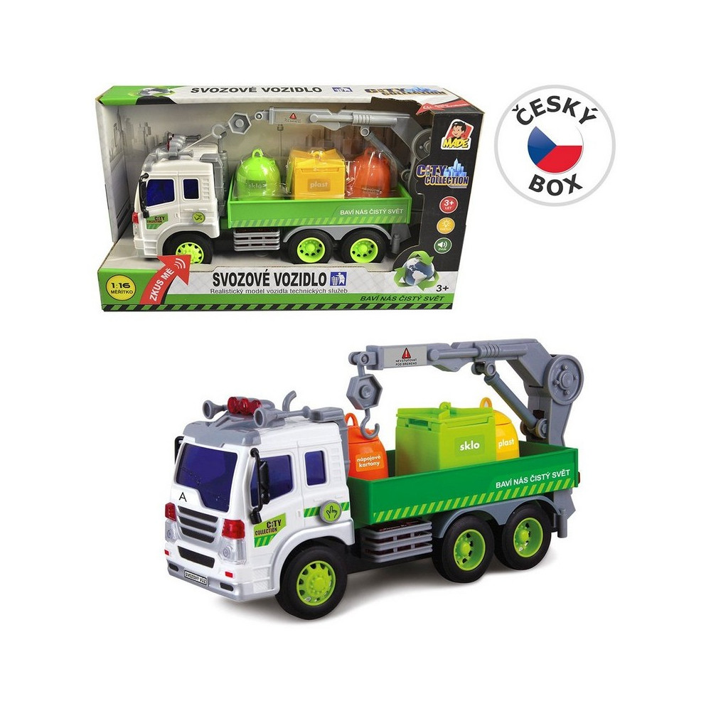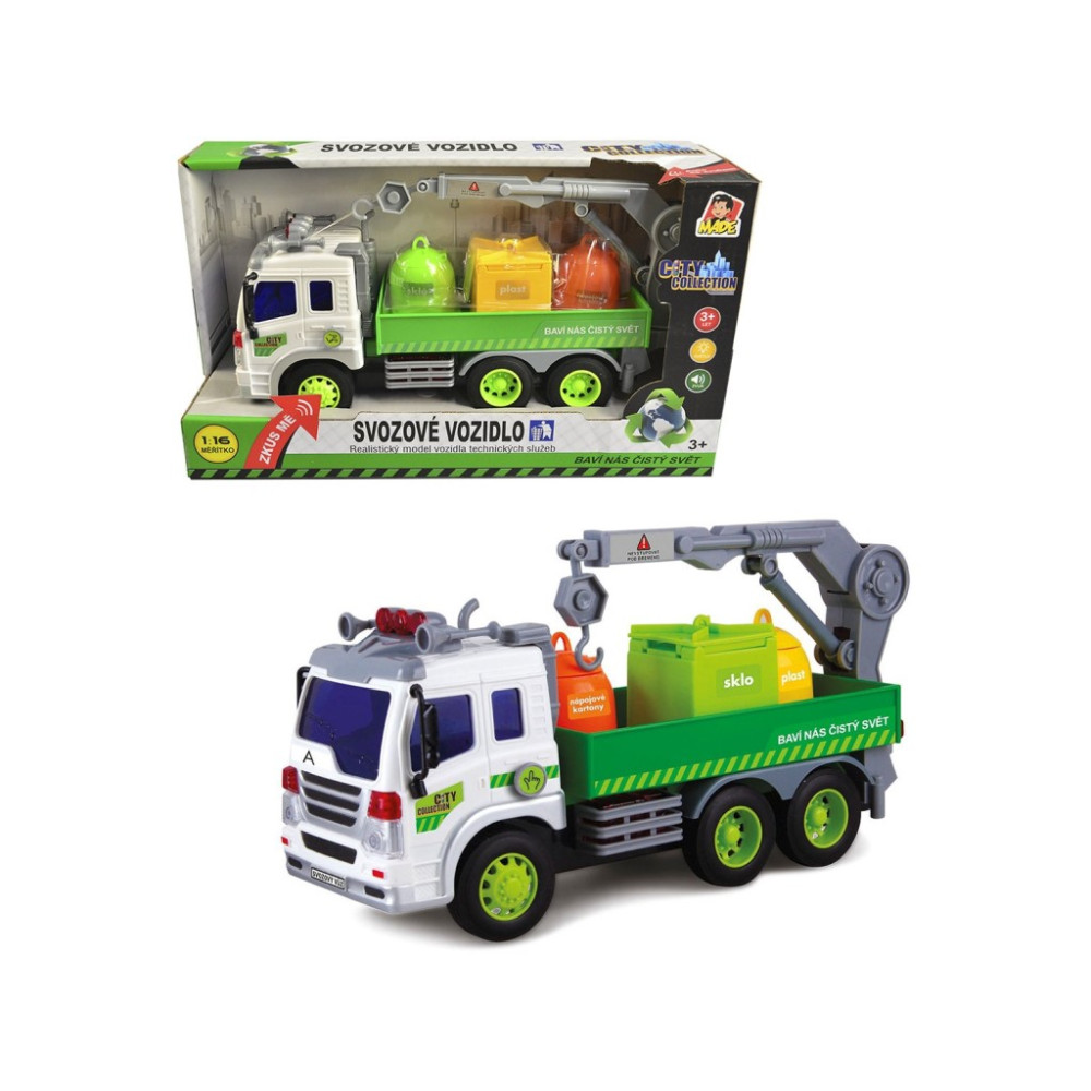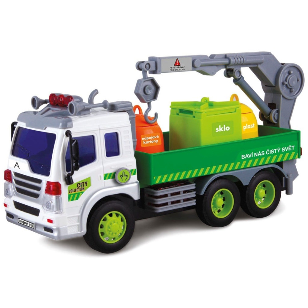 Popelářské auto na baterie, které svítí a vydává zvuk. Auto odváží roztříděný odpad, který putuje na skládku a následně se recykluje. Poznáš všechny symboly na autě? Nauč se je a chraň přírodu!
