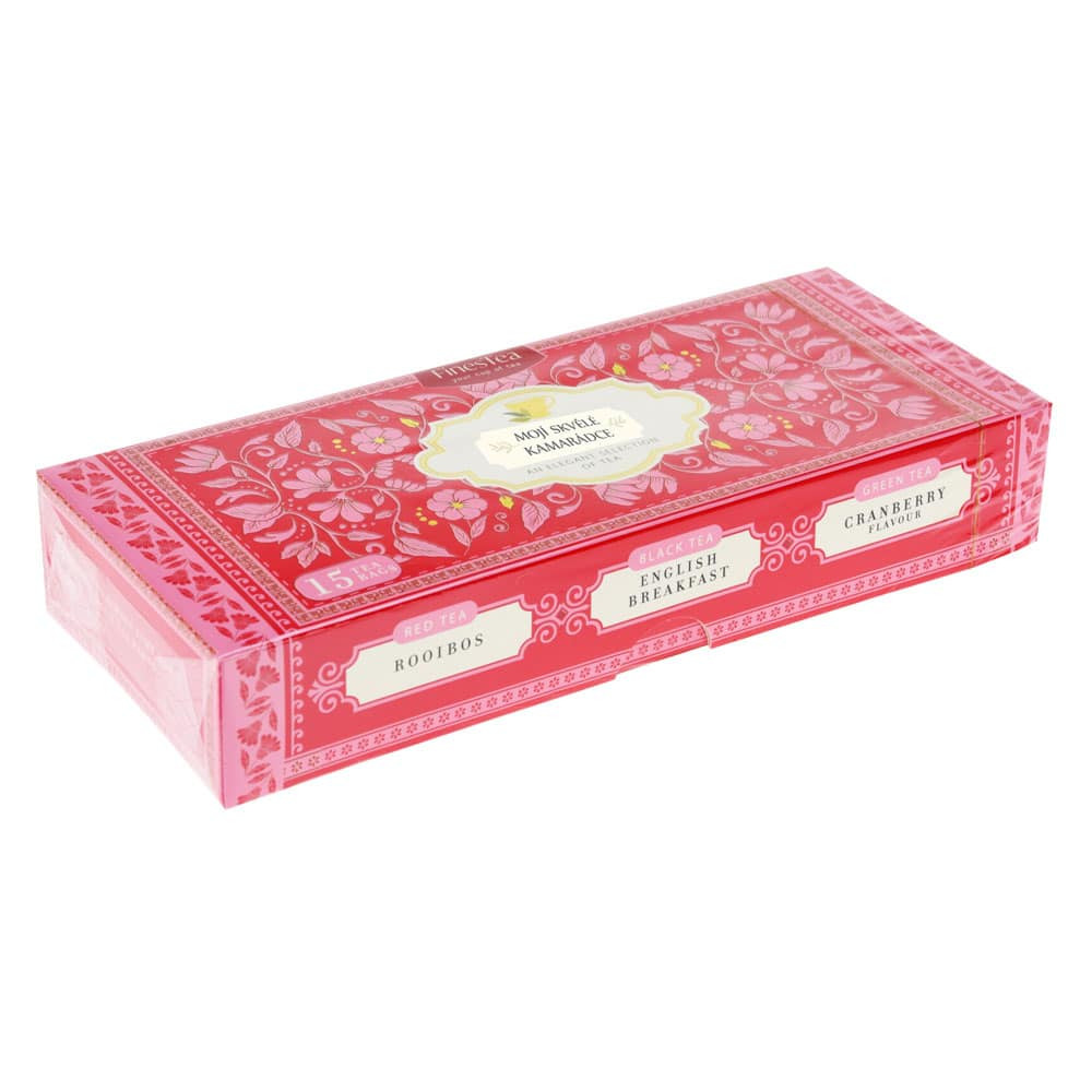 V krabičce se skrývá 15 kvalitních čajových sáčků ve třech příchutích – Red Tea Rooibos, Black Tea English Breakfast a Green Tea Cranberry.