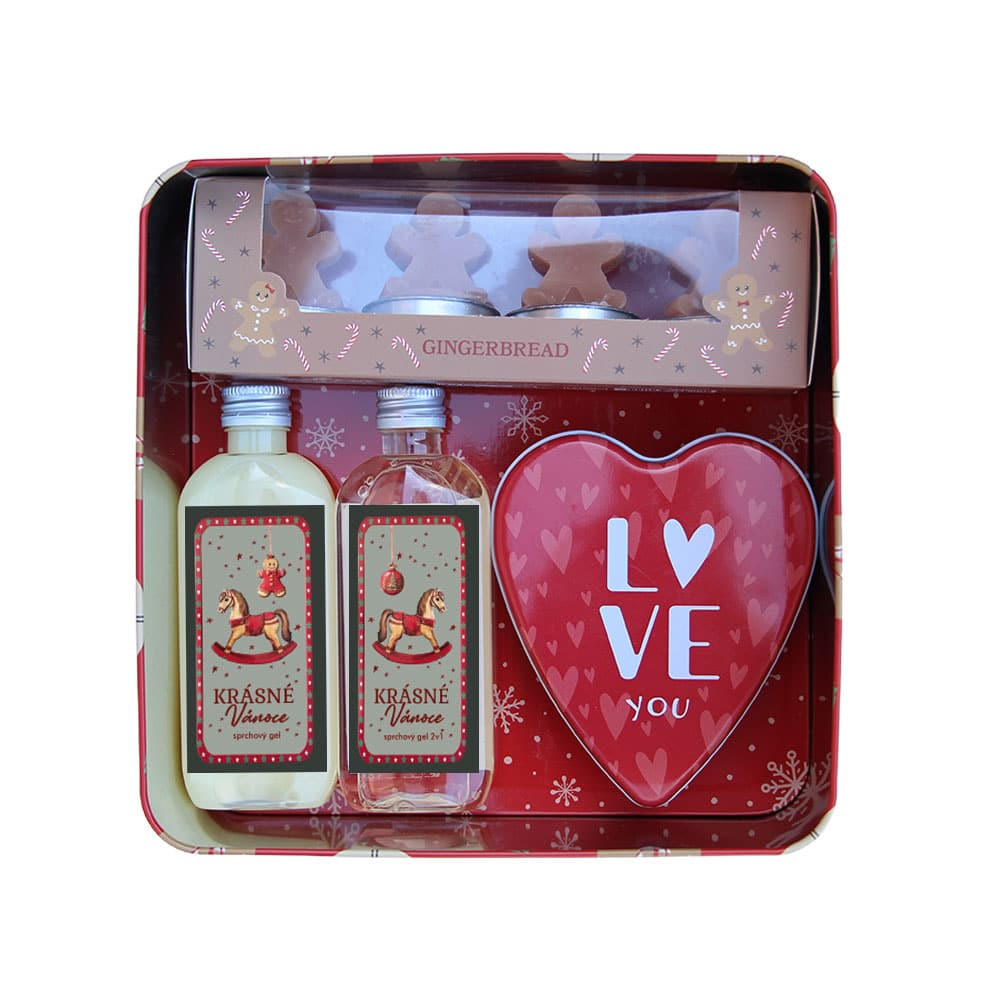 Uvnitř najdete dva sprchové gely 100 ml s vůní jablka a skořice – jeden krémový a druhý čirý 2v1, ideální pro zimní péči o pokožku. Součástí sady je také sada čtyř svíček ve tvaru vánočních perníčků a elegantní plechová krabička ve tvaru srdce vhodná na drobnosti. Vše je uloženo v krásném dárkovém balení, které potěší ženy i muže.