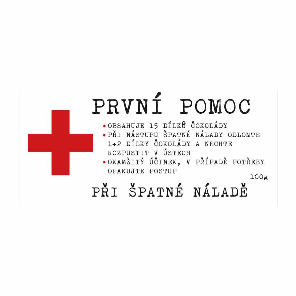 Ztrácíte klid, úsměv nebo trpělivost? Nepropadejte panice – je tu První pomoc! Tato poctivá mléčná čokoláda o hmotnosti 100 g byla speciálně vyvinuta pro akutní případy špatné nálady, ponorkové nemoci nebo pondělků.