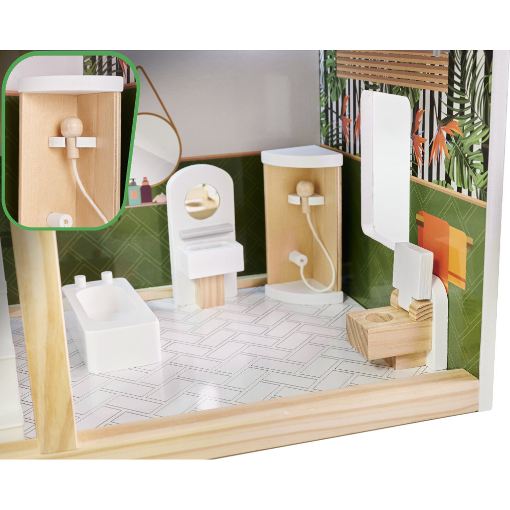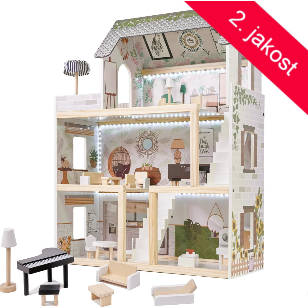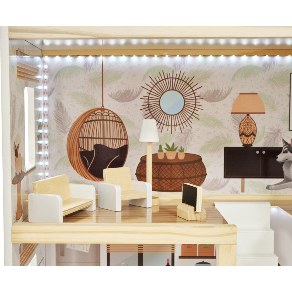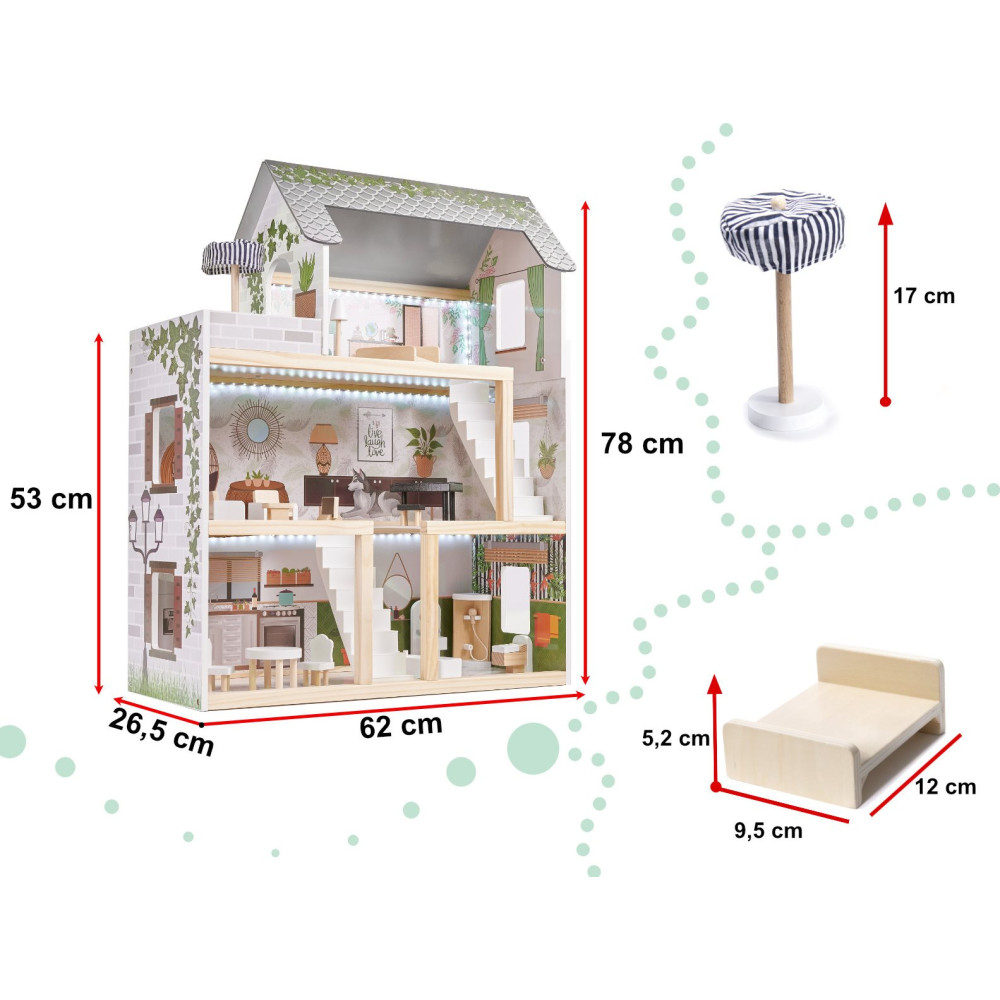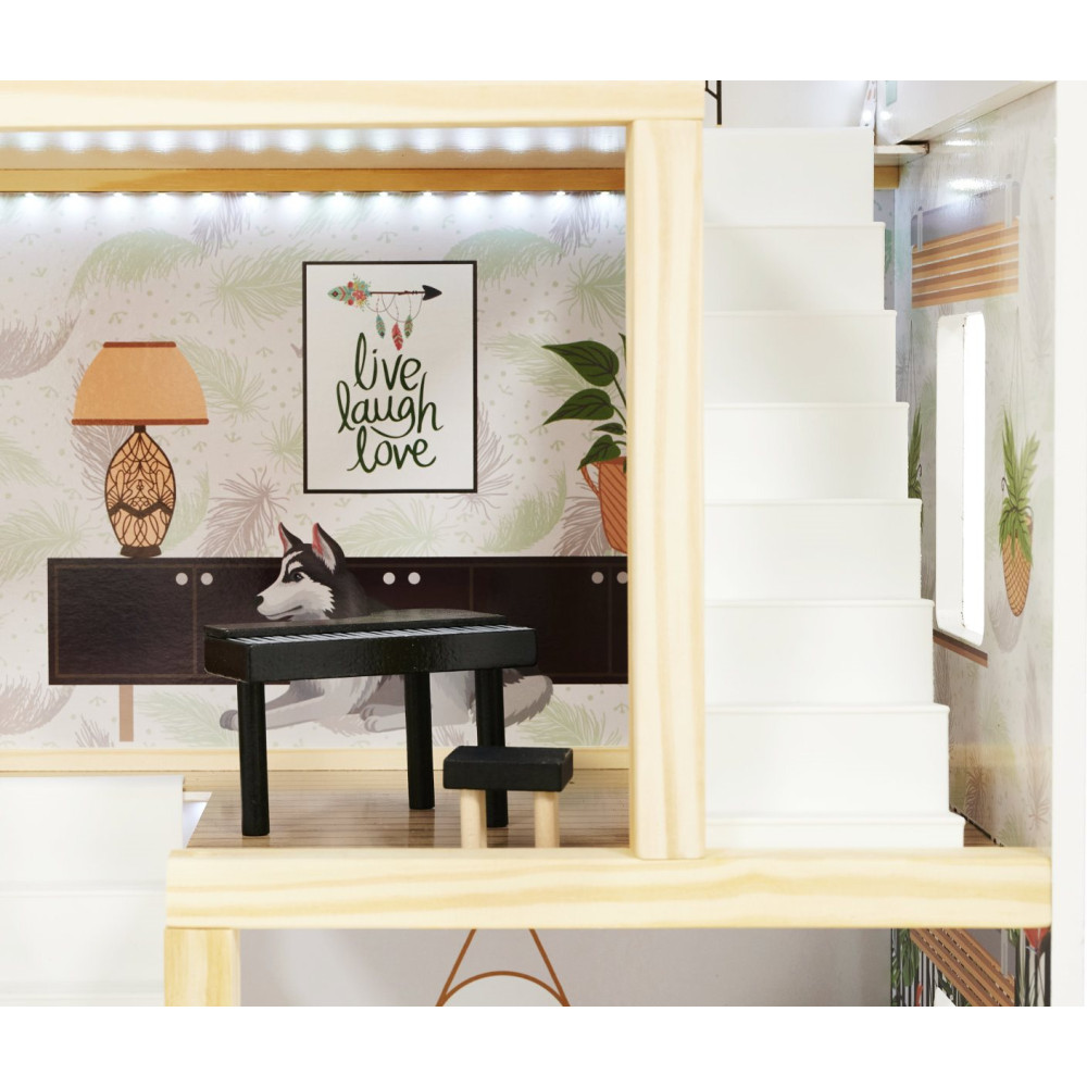 Dřevěný domeček pro panenky se spoustou doplňků. Je vyroben v boho stylu v jemných nevýrazných barvách. V tomto pohádkovém svítícím domečku se bude líbit všem panenkám, plyšákům a figurkám. Hra s domečkem zlepšuje fantazii a podporuje správný rozvoj manuálních dovedností.