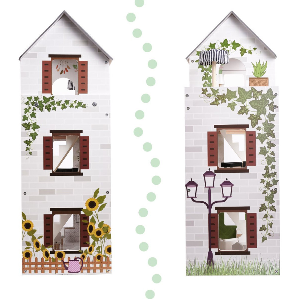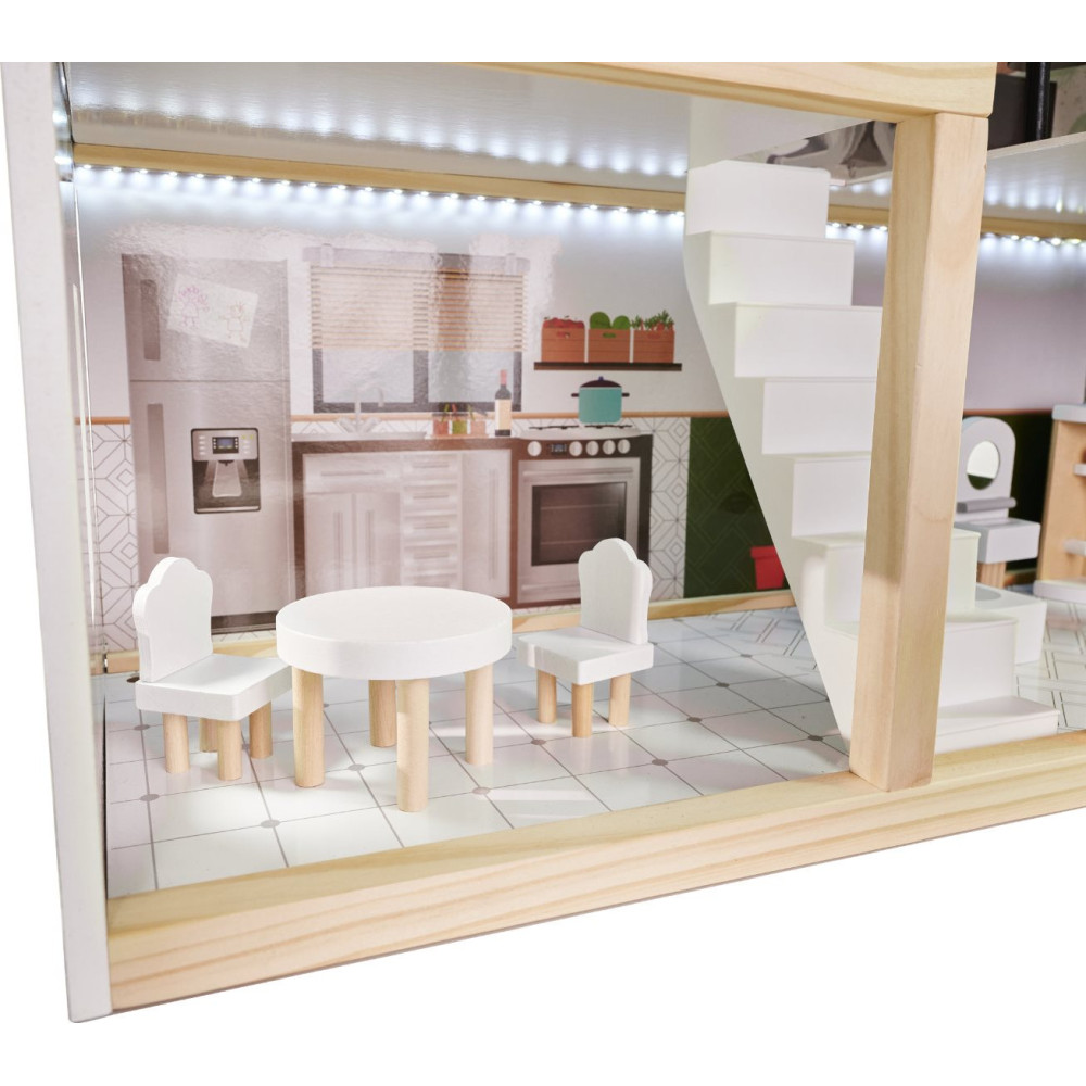 Domeček má tři patra s prostornými pokoji (kuchyň, koupelna, obývací pokoj, ložnice) a terasou. Z patra do patra vede schodiště. Vybaven je miniaturním nábytkem ze dřeva. Osvětlen pomocí LED pásků. Dřevěné části byly vyrobeny tak, aby se dětem při hře nedostaly do rukou třísky. Domeček zaručí nejen zábavu, ale bude i skvělou dekorací do dětského pokoje.