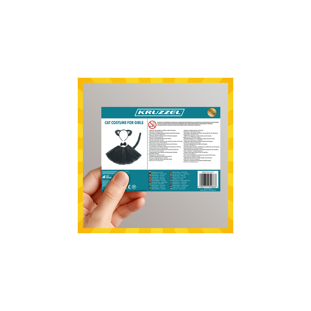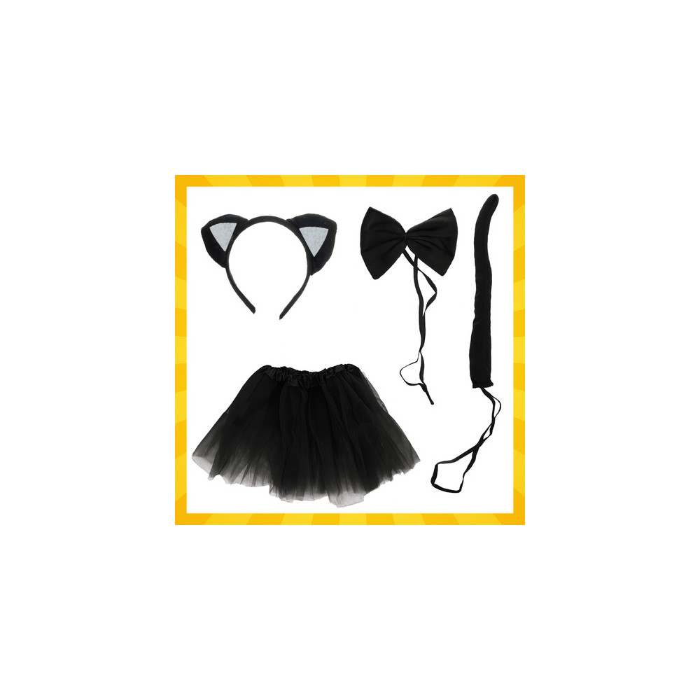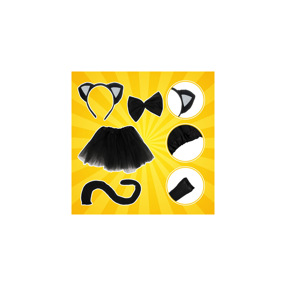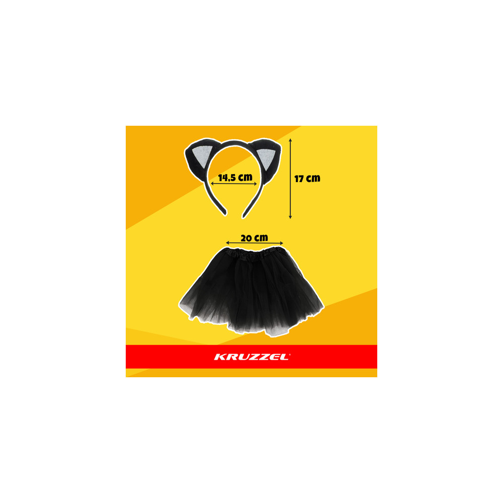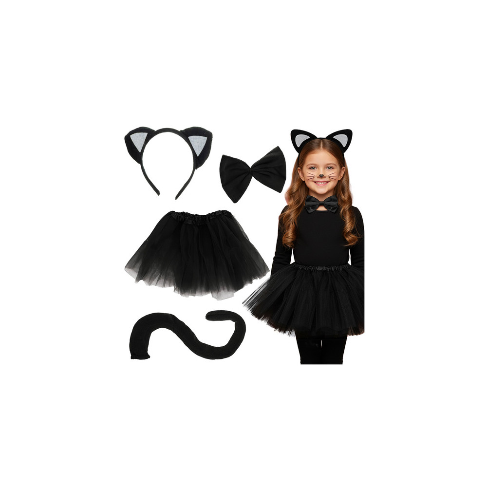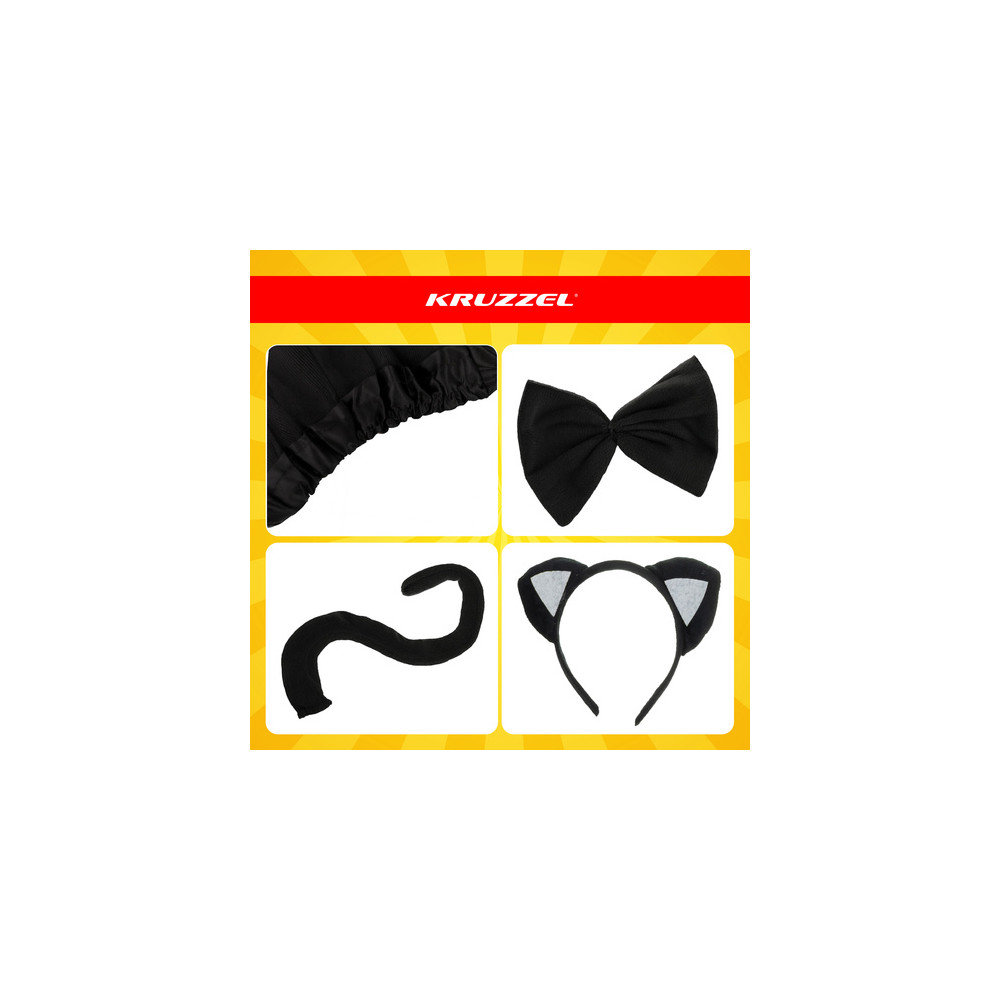 Dívčí kostým černé kočky vhodný na karneval nebo jinou dětskou párty. Je vyroben z lehkého a odolného polyesteru, který neomezuje pohyb a umožňuje dítěti volně si hrát. Součástí kostýmu je sukně, čelenka, ocásek a motýlek.