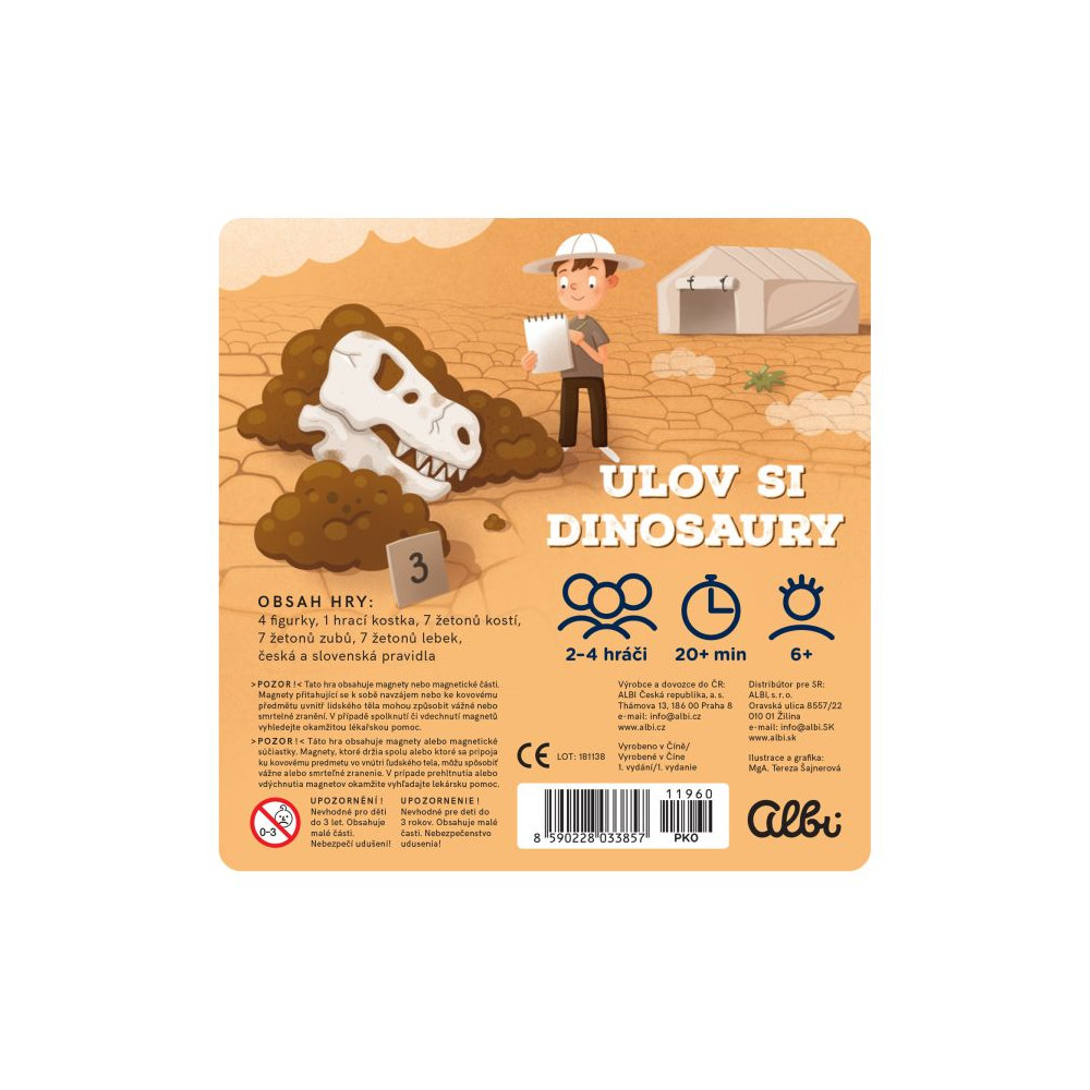 Hra obsahuje: magnetický herní plán, magnetické figurky, hrací kostku, magnetické žetony fosilií.