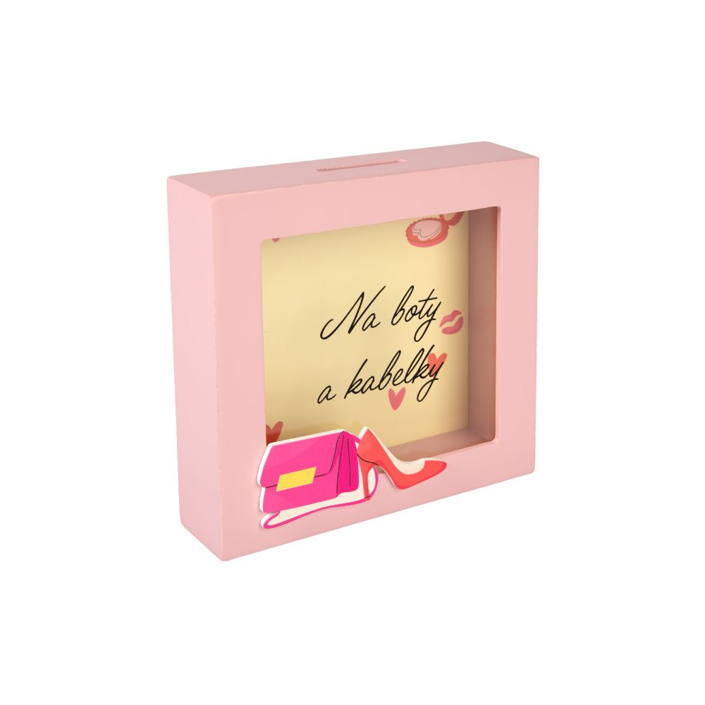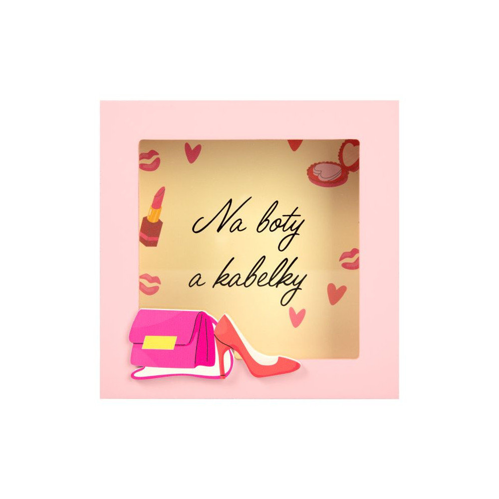 3D pokladnička v rámečku pro všechny ženy. Přední stranu rámečku zdobí kabelka a střevíc.