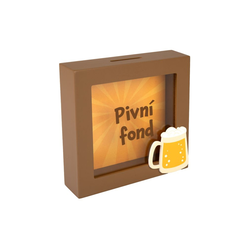 3D pokladnička v rámečku pro všechny pivaře. Přední stranu rámečku zdobí půllitr piva, zadní stranu pokladničky oranžové pozadí.