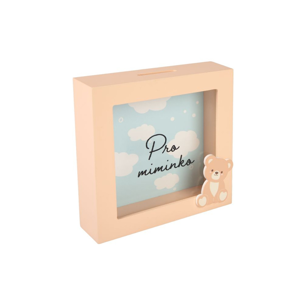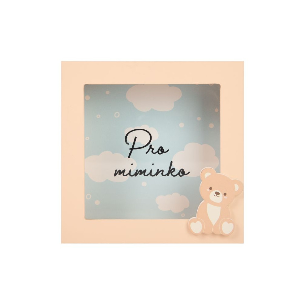 3D pokladnička v rámečku pro všechny budoucí rodiče. Přední stranu rámečku zdobí roztomilý medvídek, zadní stranu pokladničky motiv oblohy.