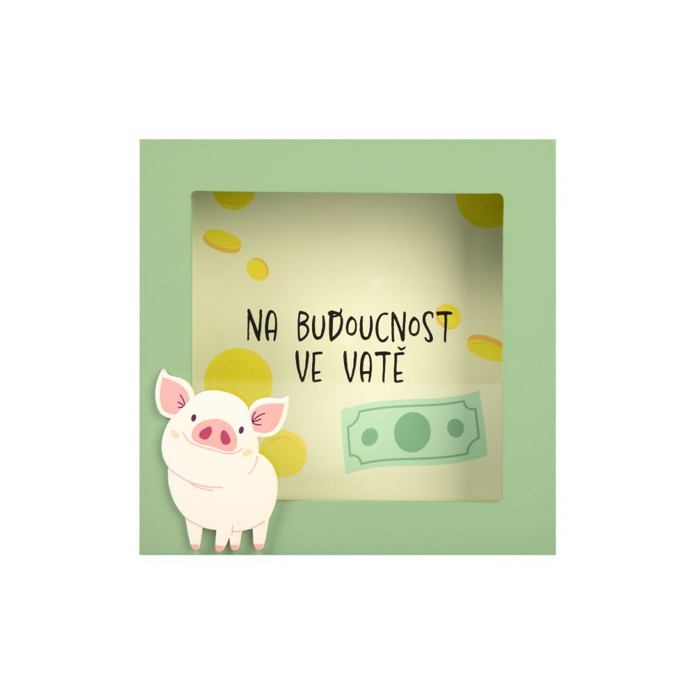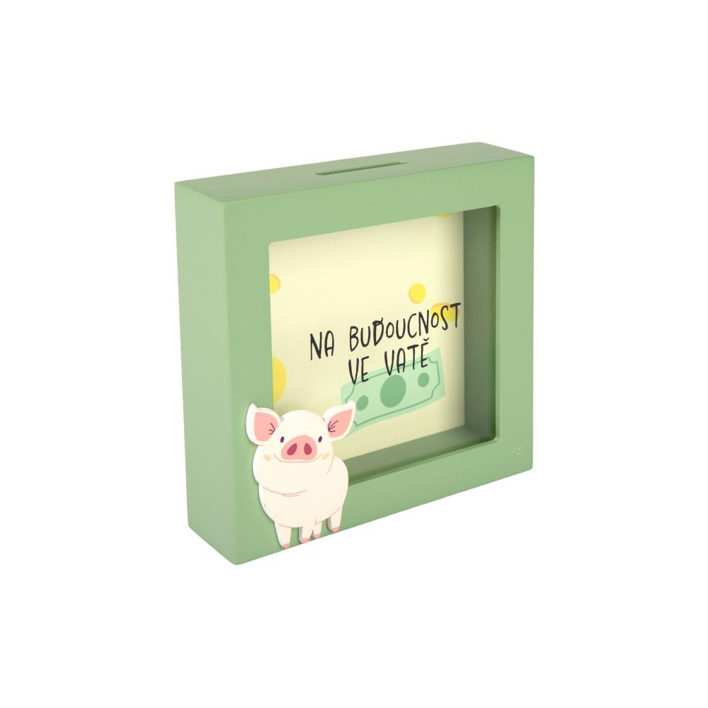 3D pokladnička v rámečku pro všechny šetřílky. Přední stranu rámečku zdobí roztomilé prasátko, zadní stranu pokladničky motiv peněz.