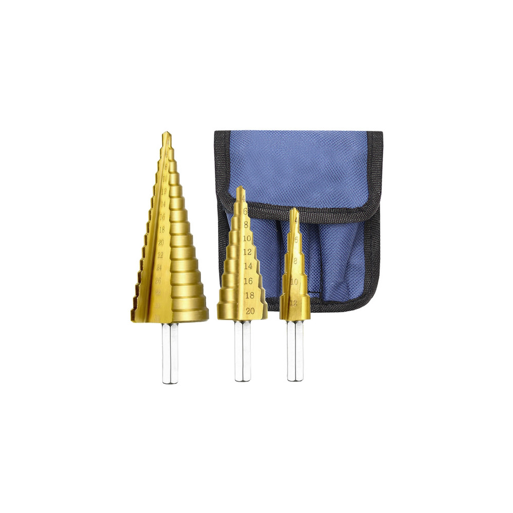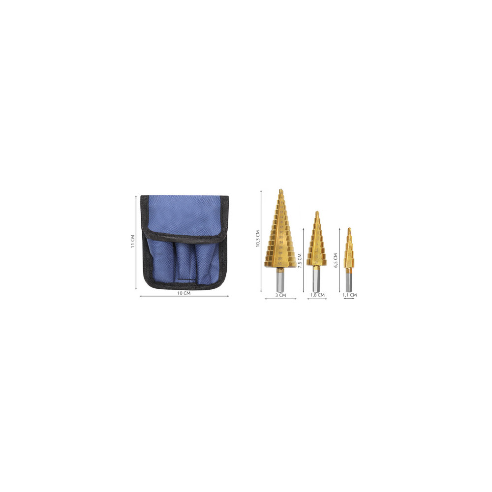 Kuželové vrtáky vyrobeny z rychle řezné, odolné a trvanlivé ložiskové oceli potažené titanem, díky čemuž jsou ideální pro vrtání otvorů do PVC, tenkostěnných plechů a dokonce i kovu. Sada je umístěna v praktickém pouzdru.