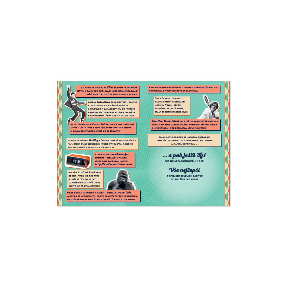 Originální přání s motivem roku narození. Na přání najdete zajímavé události, které se v daném roce staly, a také známé osobnosti, které se v témže roce narodily.