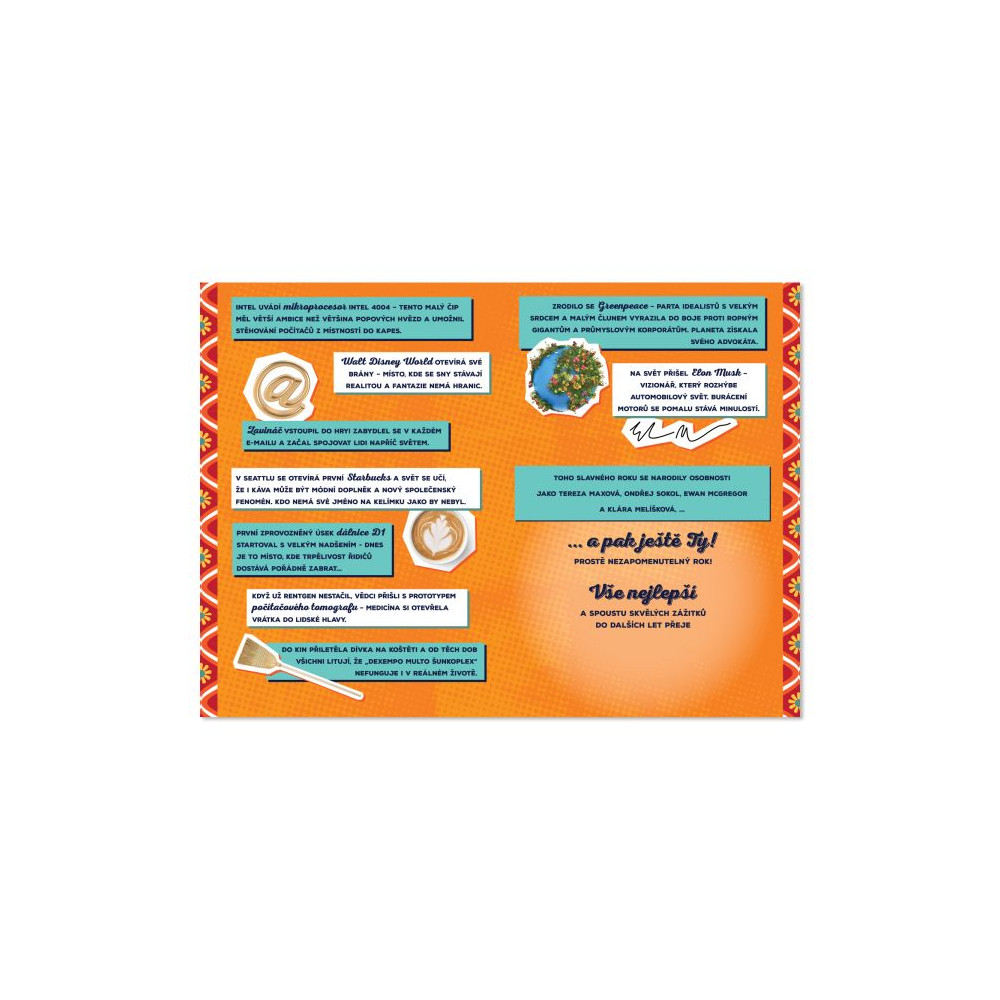 Originální přání s motivem roku narození. Na přání najdete zajímavé události, které se v daném roce staly, a také známé osobnosti, které se v témže roce narodily.
