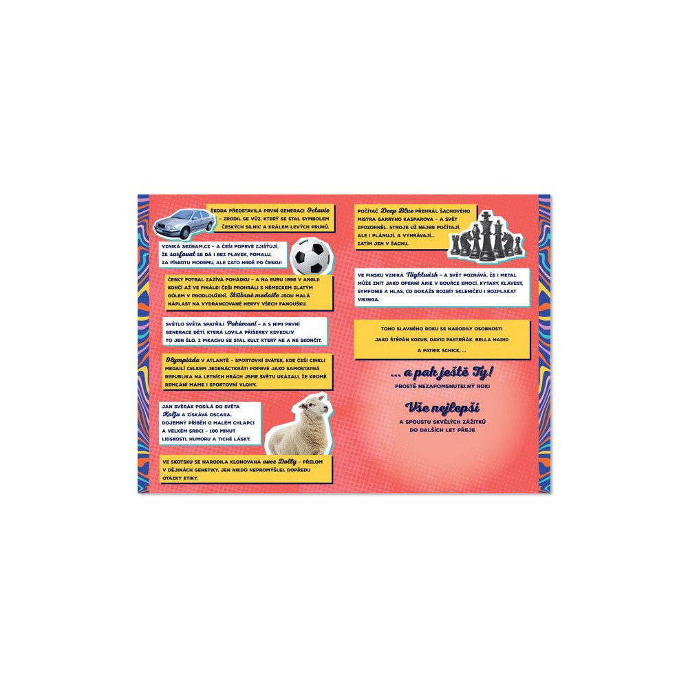 Originální přání s motivem roku narození. Na přání najdete zajímavé události, které se v daném roce staly, a také známé osobnosti, které se v témže roce narodily.
