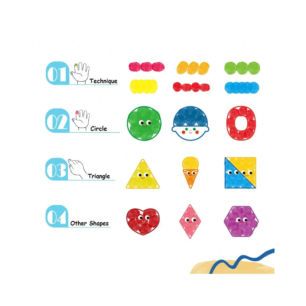 Blok obsahuje také návod jak s prstovými barvami tvořit. Předlohy je možné využít i na barvy v tubě. Děti tak můžou využít předlohy i v začátcích tečkování - dot paintingu nebo u klasického malování štětcem. Cvičí si přitom jemnou motoriku, grafomotoriku a seznamují se s kouzelným světem tvoření. Nakonec jim zůstanou krásné obrázky, které se dají z bloku jednoduše vytrhnout.