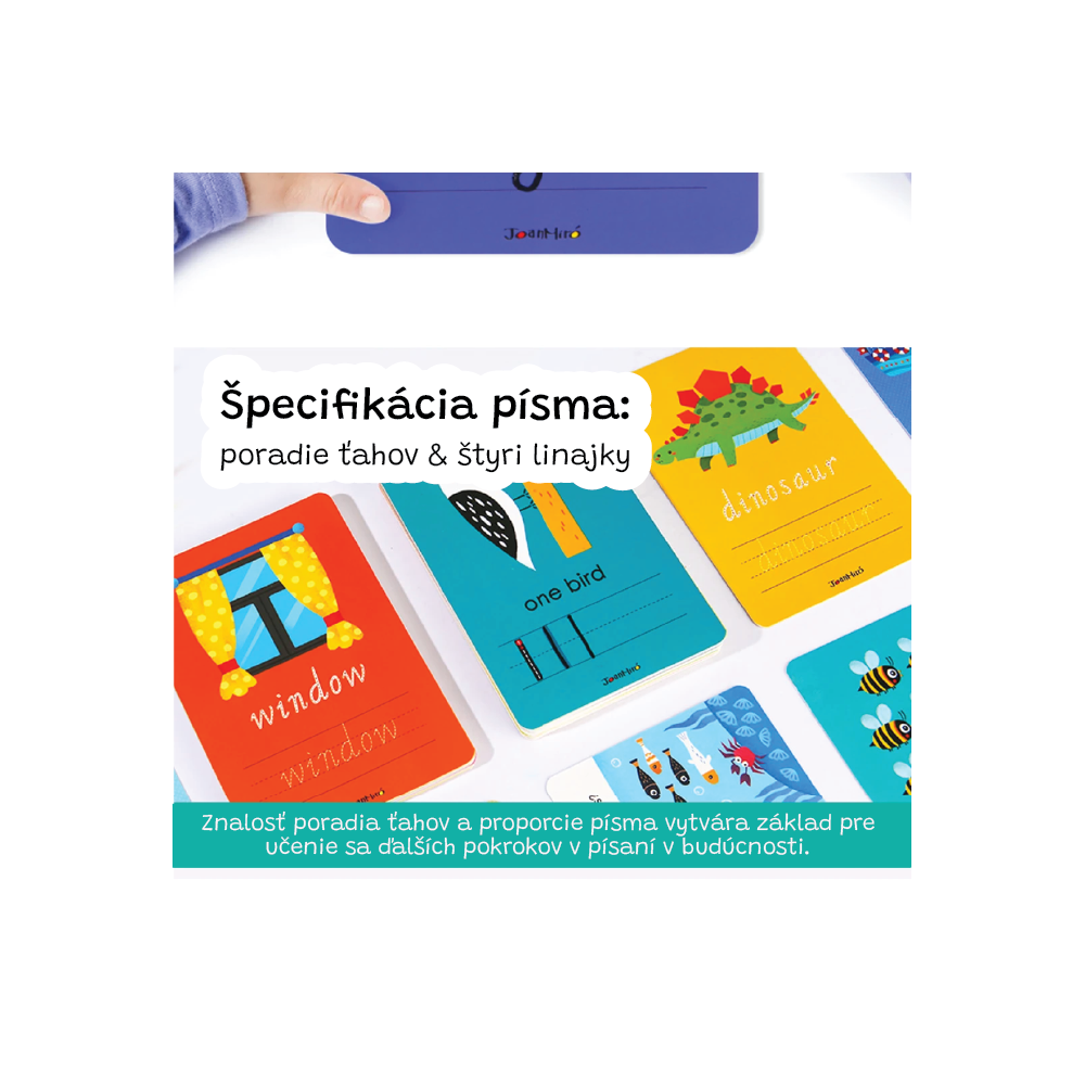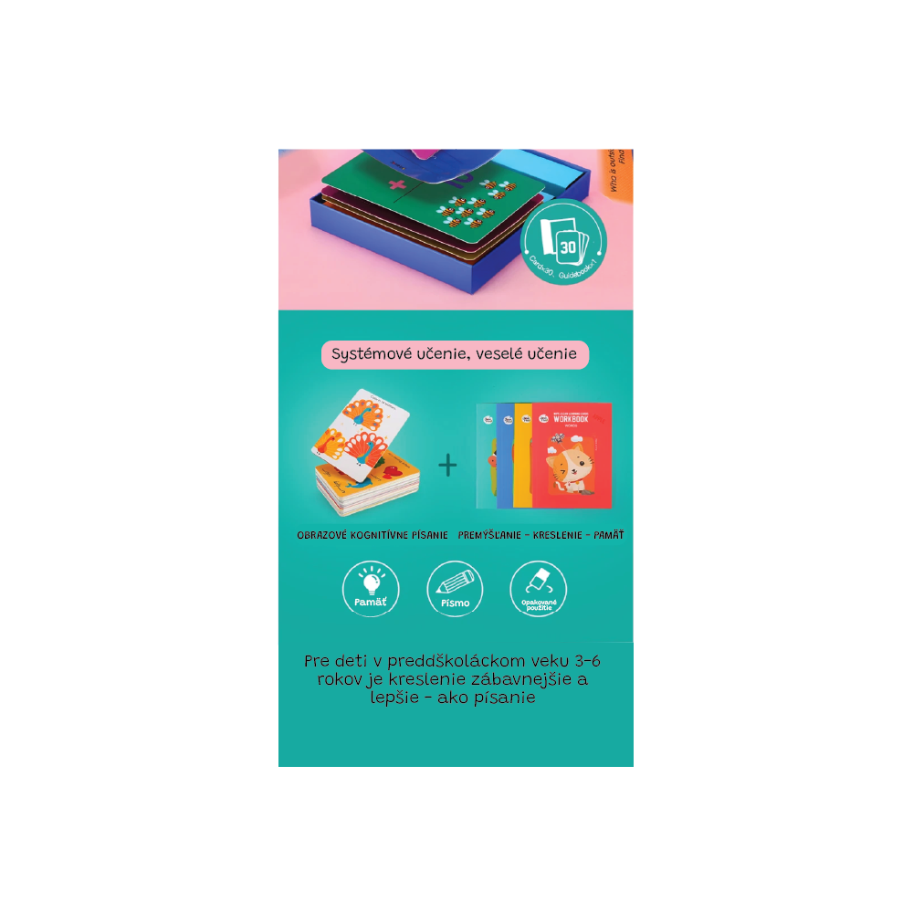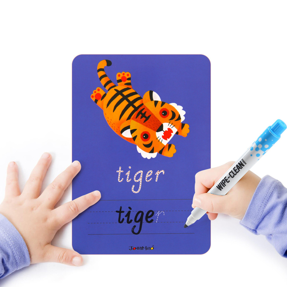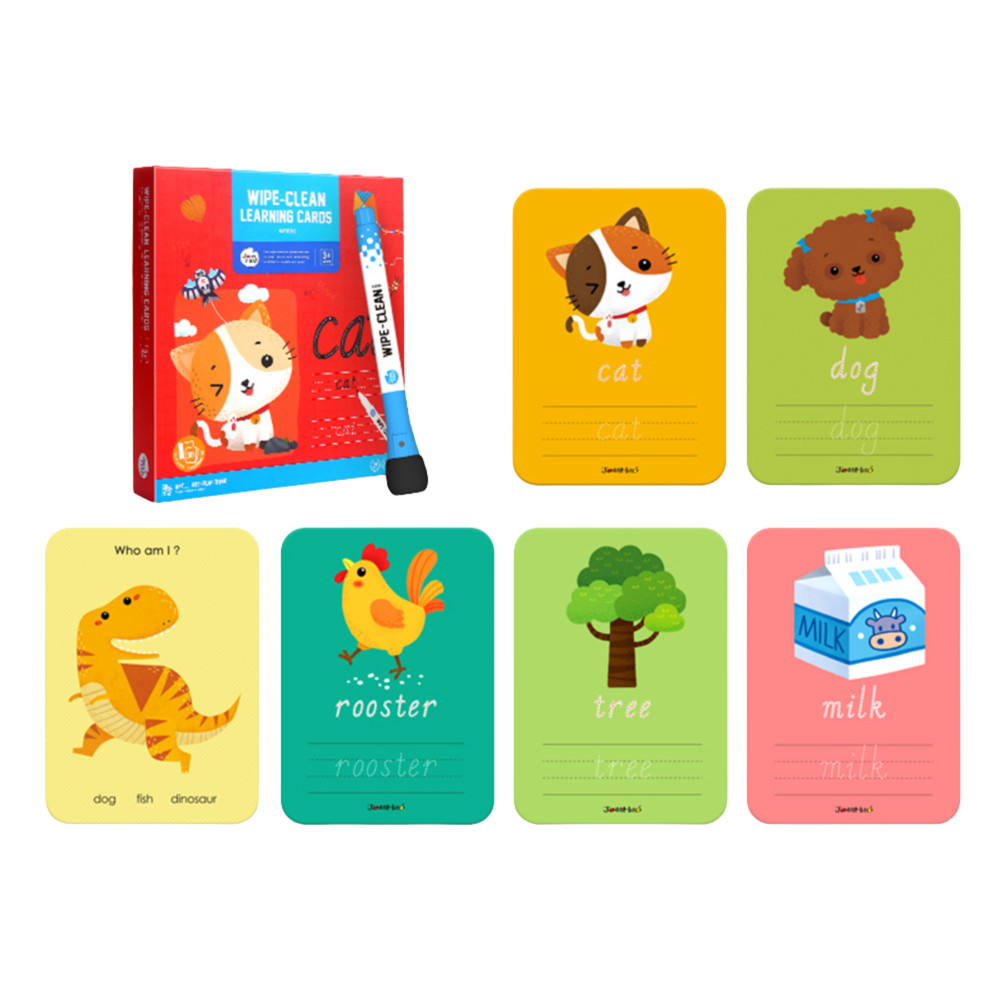 Stírání, učení a zábava v jednom. Tato barevná edukační sada obsahuje tematické kartičky s anglickými slovy, na kterých můžete znovu zkoušet psaní. Děti si při hře procvičují čtení, rozvíjejí jemnou motoriku a učí se angličtinu hravě - vše se stíracím fixem a předdefinovanými slovy, které jednodušše obtahují. Každé slovo má svůj obrázek pro snazší zapamatování.