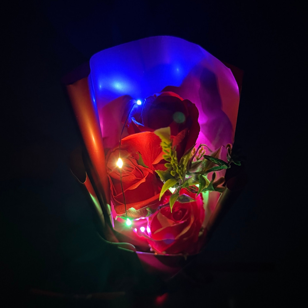 Romantická kytice růží v dárkovém balení je vhodná pro darování z lásky na Valentýna nebo jen tak pro radost. Růže jsou vloženy v průhledné dárkové krabičce se zlatým detailem. Jsou omotané barevnými světýlky, které svítí a blikají na 3 různé režimy (rychlé blikání, pomalejší blikání a stálé svícení).