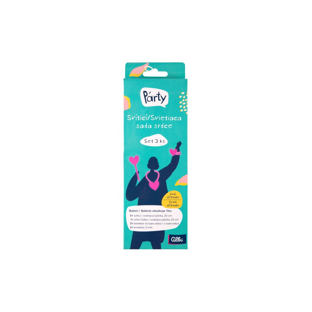 Svítící sada srdce v setu tří kusů, se kterou rozzáříte každou párty! Balení obsahuje tyčinky, které po aktivaci svítí ve tmě a konektory. Ze sady vyrobíte svítící náhrdelník, hůlku a náramek ozdobené srdíčky. Svítící tyčinky vydrží svítit až 5 hodin!