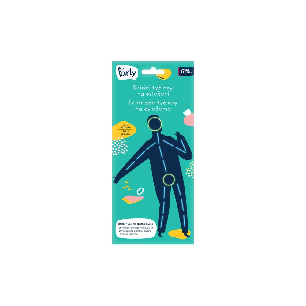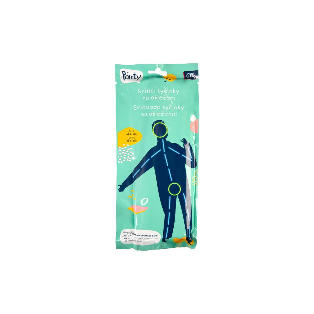 Sada svítících tyčinek na oblečení v provedení pro chlapce se kterou rozzáříte každou párty! Balení obsahuje tyčinky, které po aktivaci svítí ve tmě, konektory a nalepovací proužky. Svítící tyčinky vydrží svítit až 5 hodin!