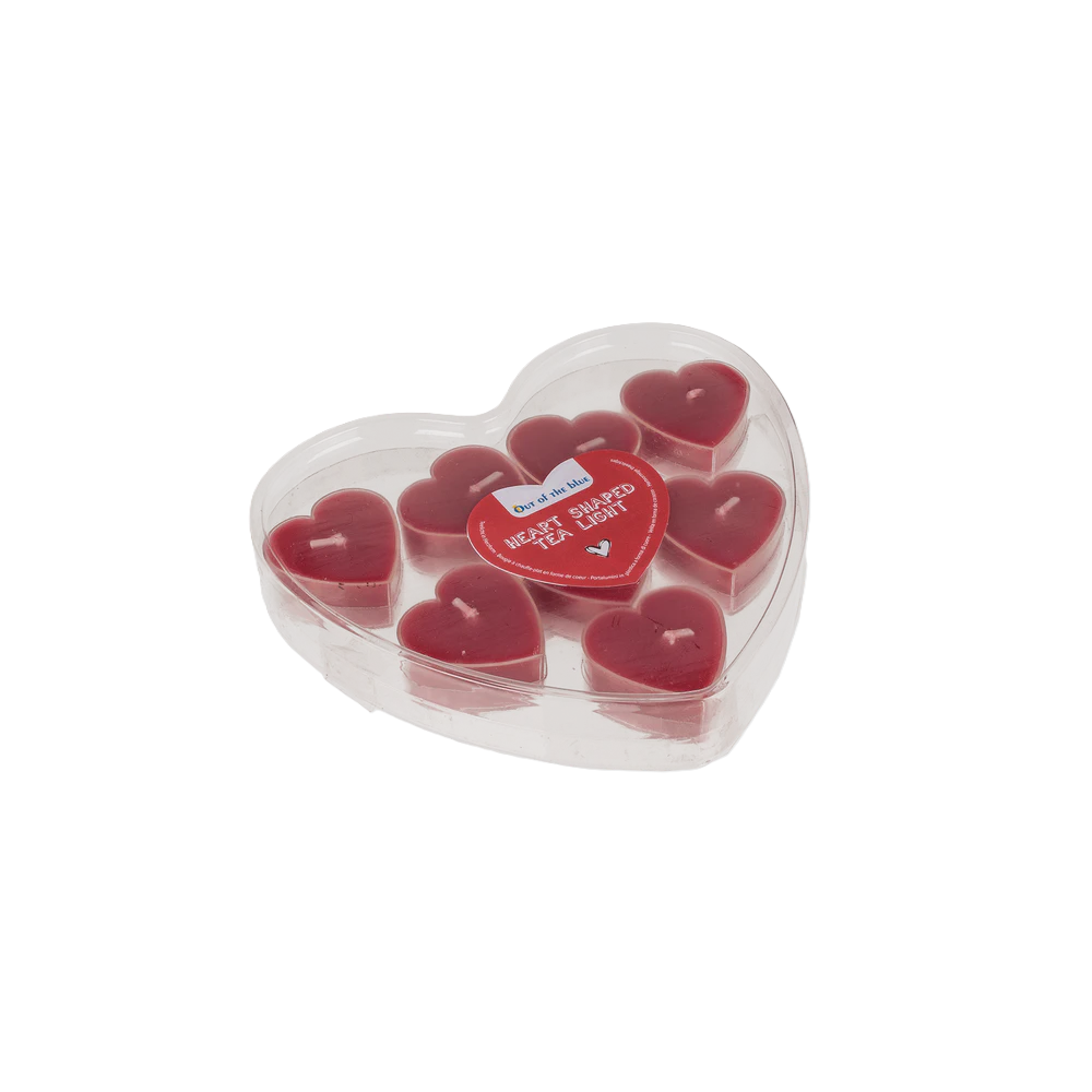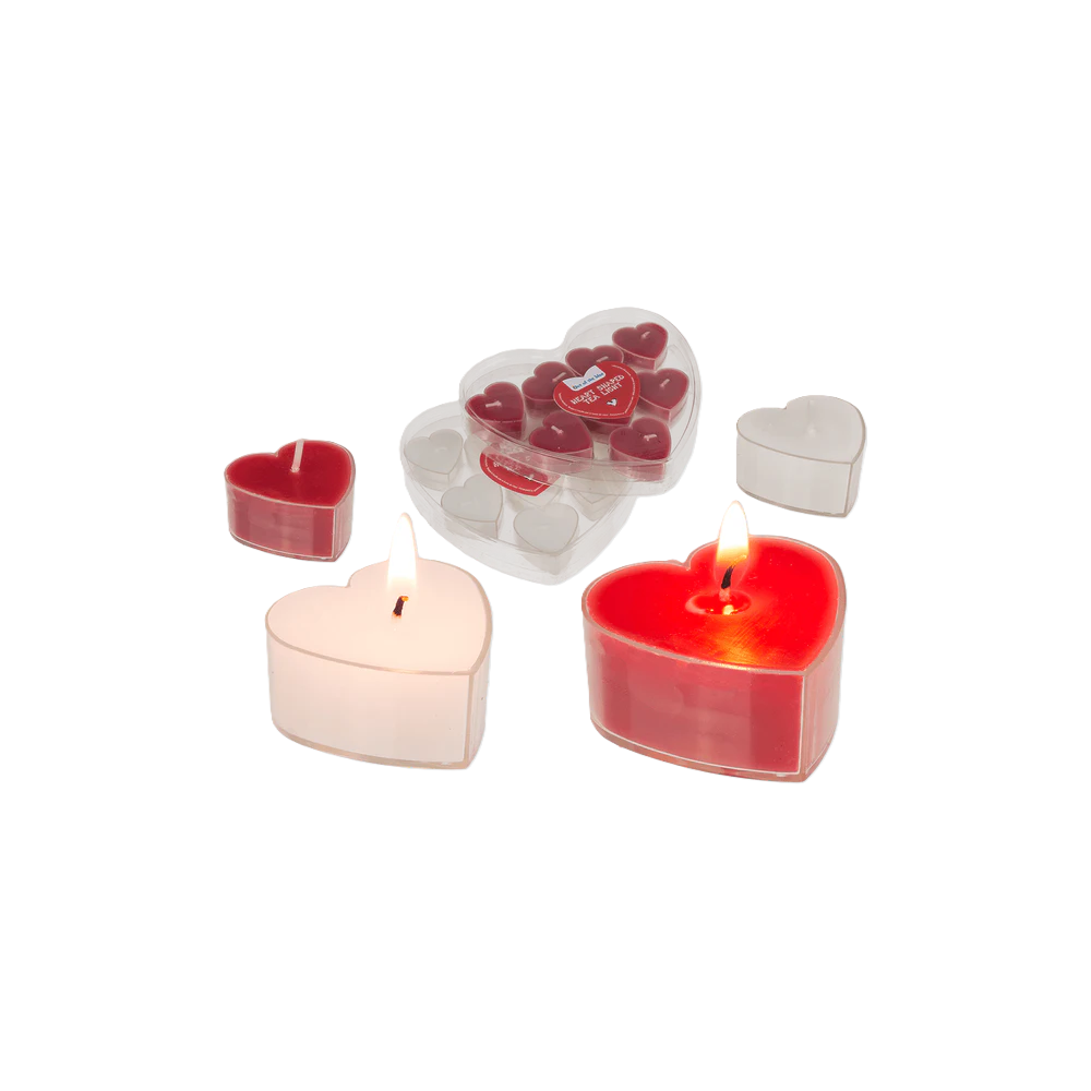 Balení čajových svíček ve tvaru srdíček ve velkém plastovém obalu ve tvaru srdce.