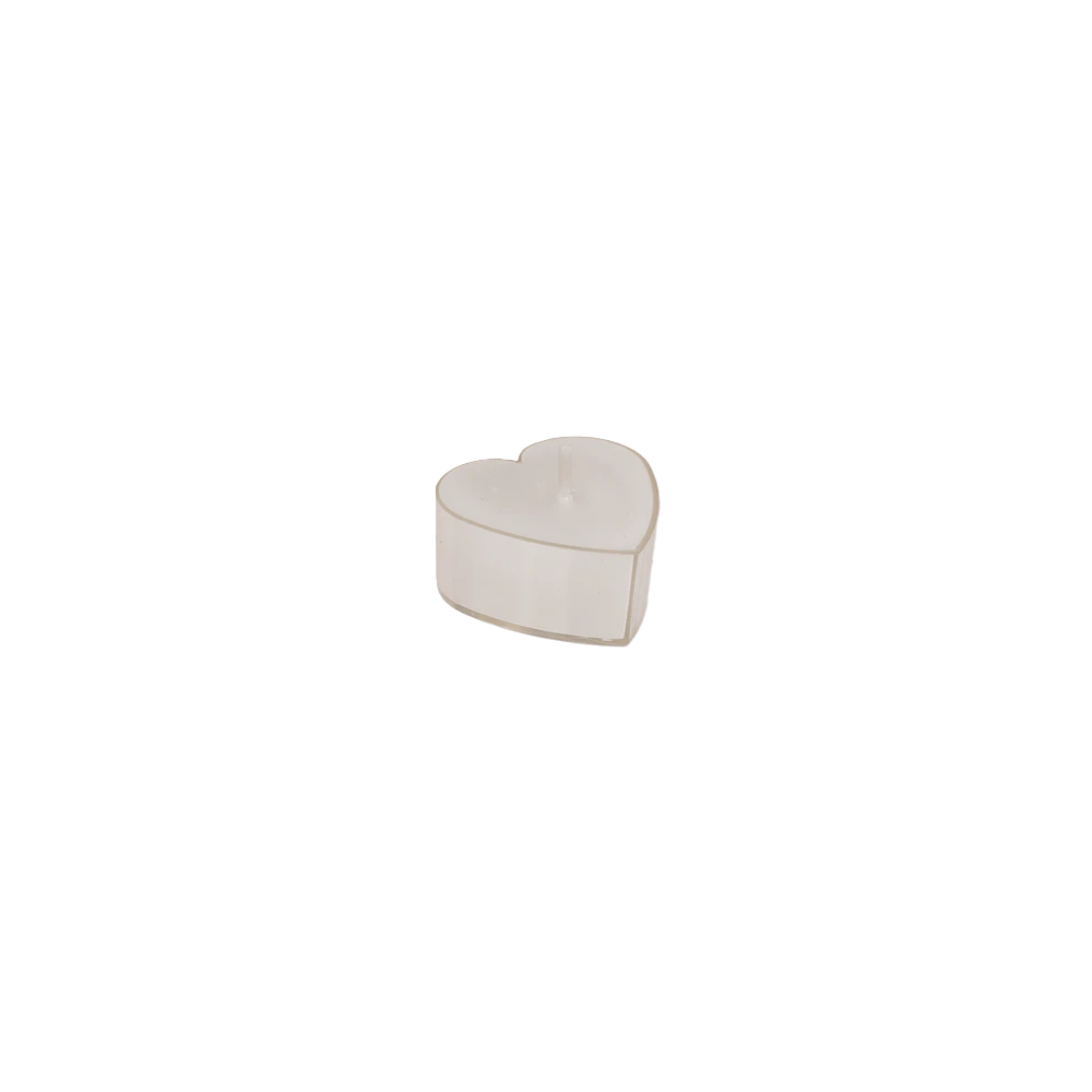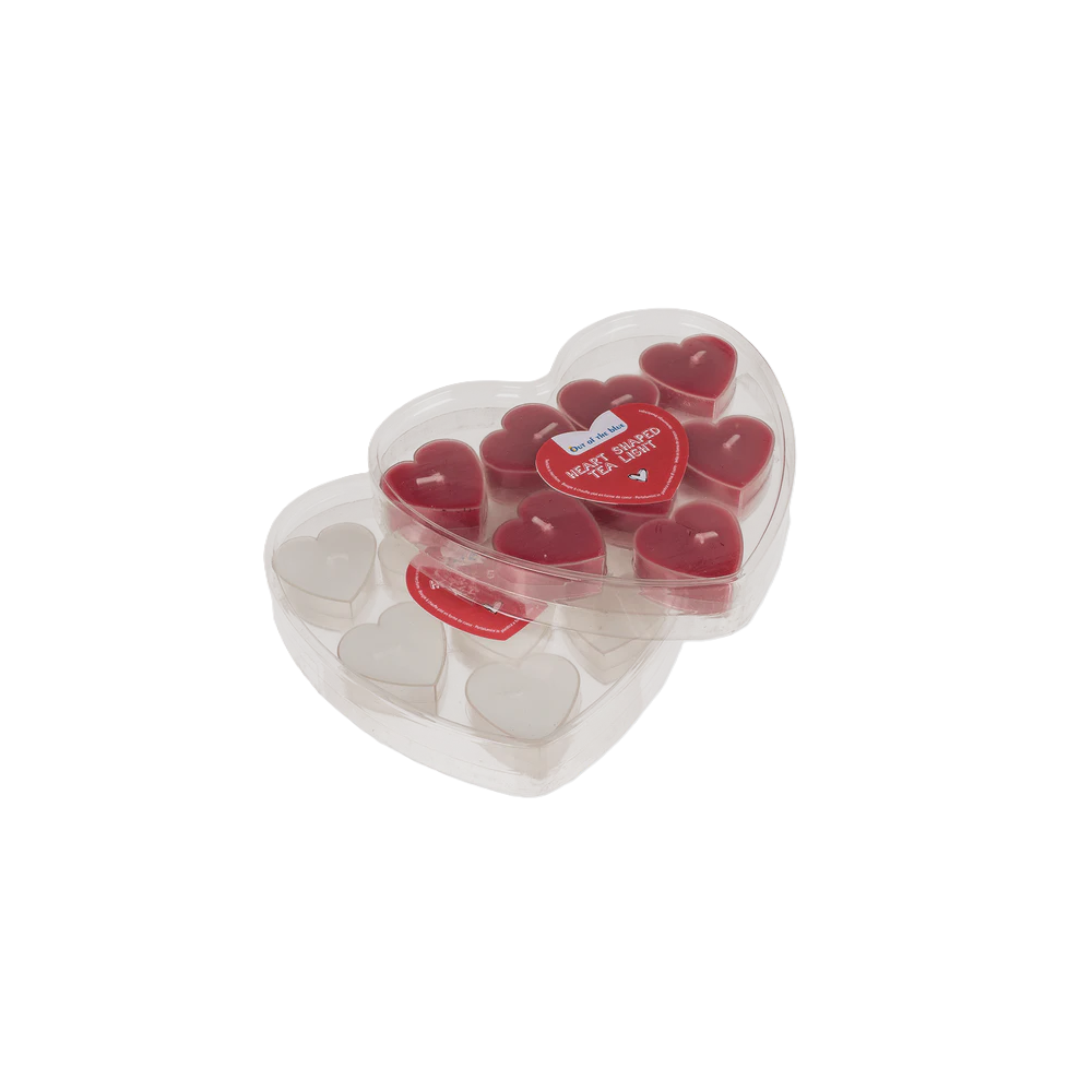 Balení čajových svíček ve tvaru srdíček ve velkém plastovém obalu ve tvaru srdce.